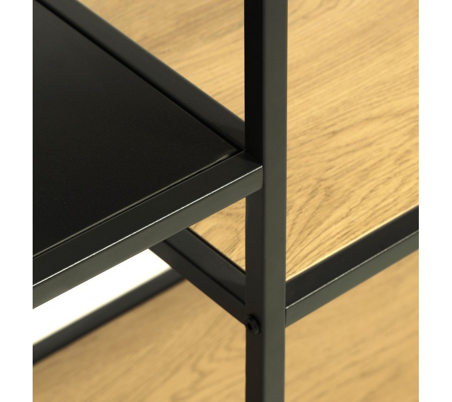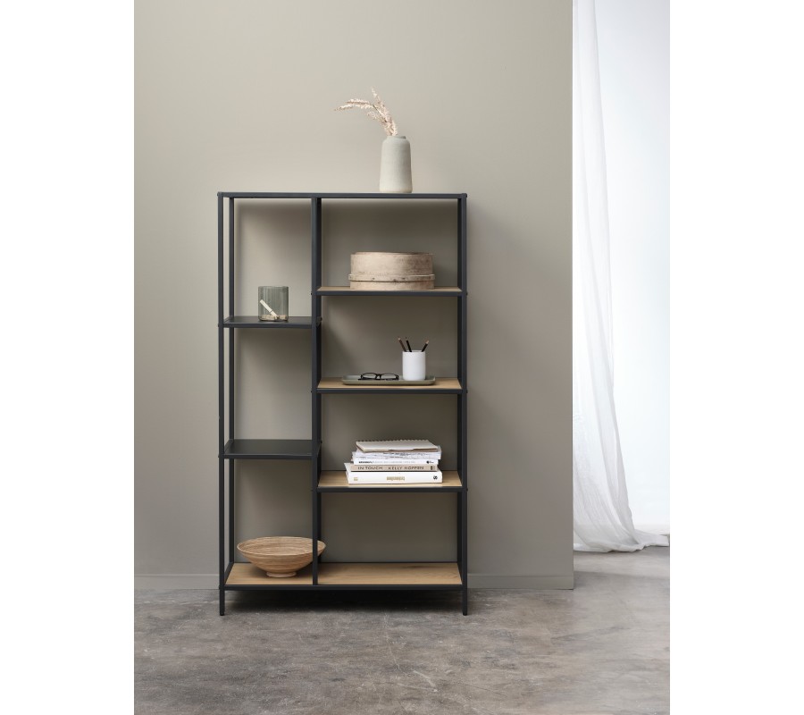 Moderní industriální knihovna Helin zaujme jednoduchým architektonickým designem a kontrastní kombinací materiálů. Tenká černá kovová konstrukce vytváří vzdušnou, geometricky čistou siluetu, kterou doplňují police s povrchem v dubovém vzhledu v přírodní hnědé barvě. Přirozená kresba dřeva přináší do designu teplejší prvek a příjemně vyvažuje technický charakter kovového rámu.