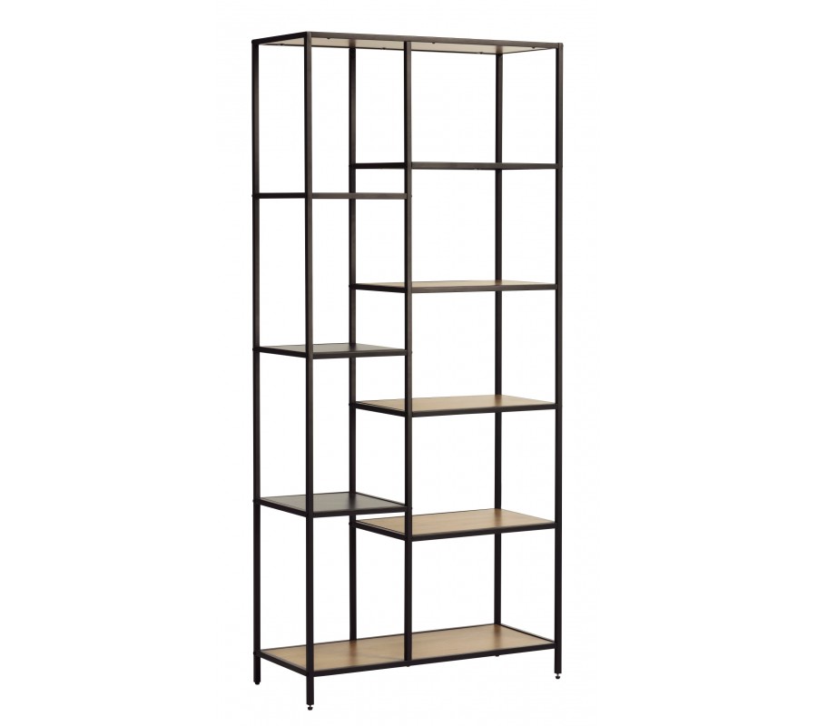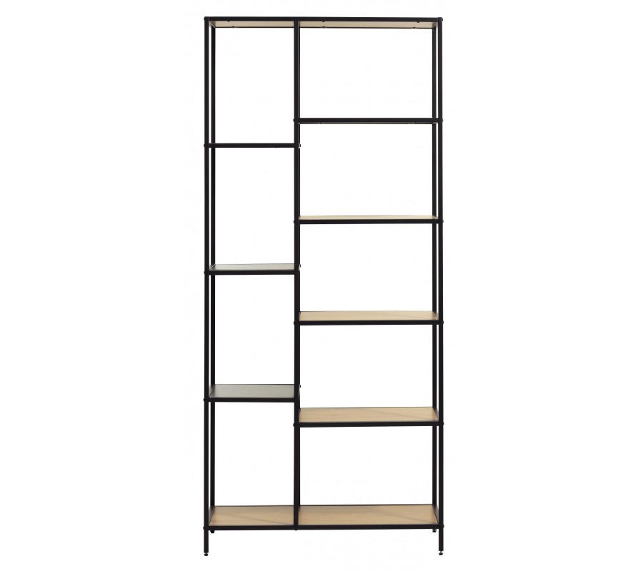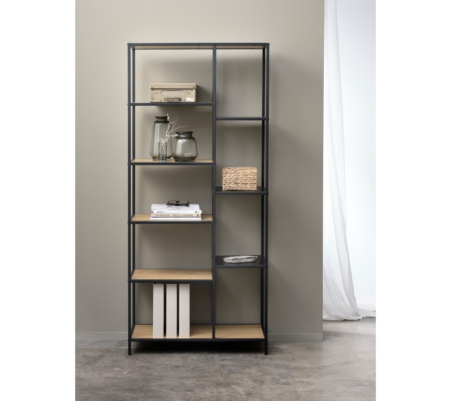 Knihovna nabízí osm otevřených polic, které jsou rozmístěny v asymetrické kompozici. Nalevé straně se nacházejí tři menší čtvercové police umístěné nad sebou, zatímco na pravé straně jsou čtyři obdélníkové police v různých výškách. Úplně spodní část doplňuje ještě jedna široká obdélníková police, která propojuje celou konstrukci a poskytuje největší odkládací prostor. Střídání velikostí a polohy polic vytváří zajímavý vizuální rytmus a zároveň umožňuje prakticky kombinovat knihy, dekorace, rostliny či úložné boxy.