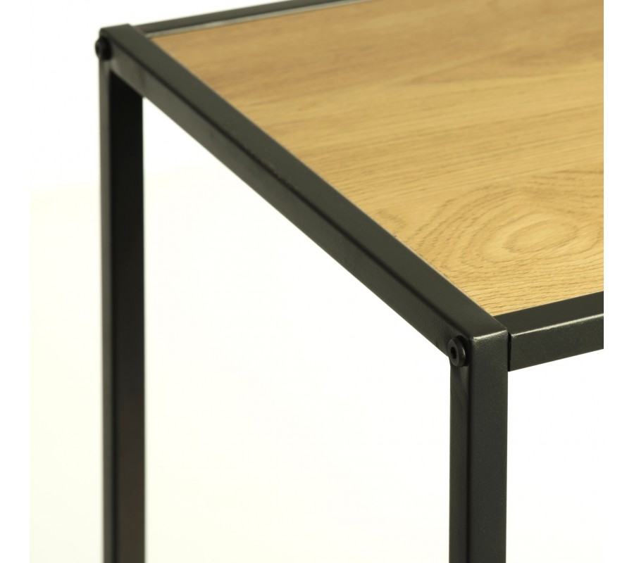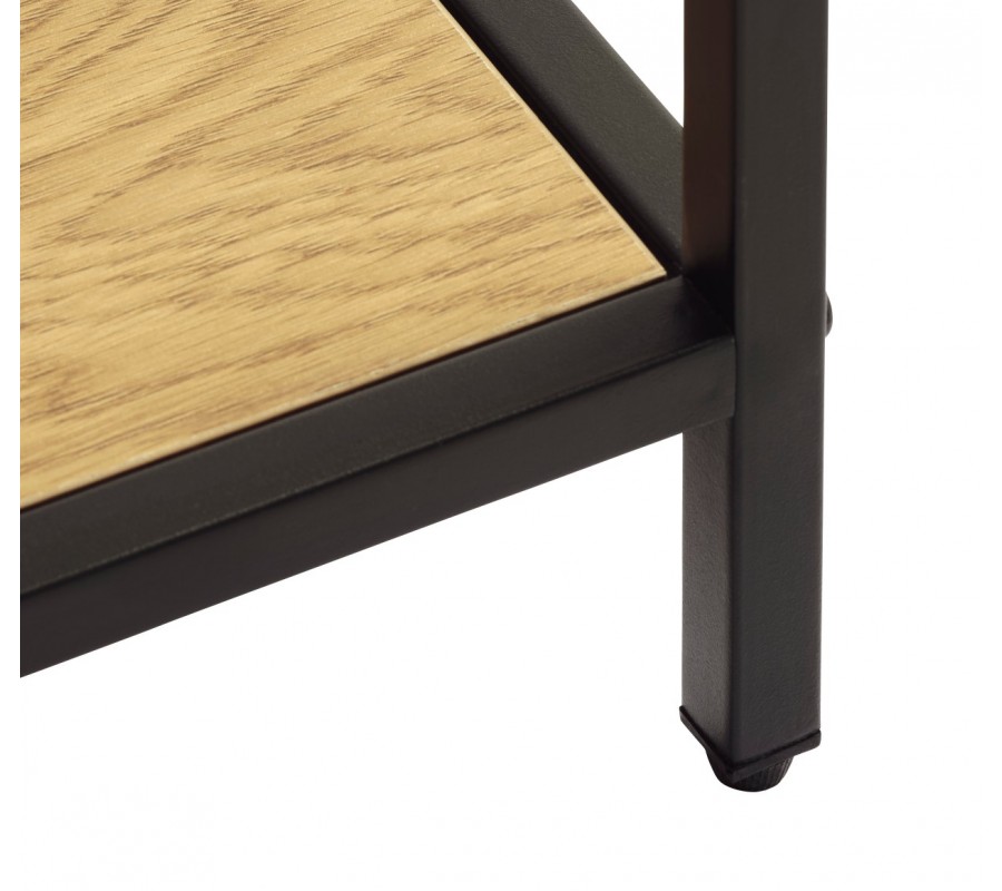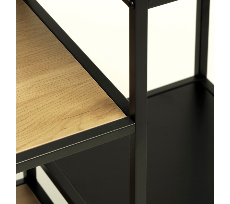 Moderní industriální knihovna Helin zaujme čistým geometrickým designem a kontrastní kombinací materiálů. Tenká černá kovová konstrukce vytváří vzdušnou, architektonicky jednoduchou siluetu, kterou doplňují police s povrchem v dubovém vzhledu v přírodní hnědé barvě. Přirozená kresba dřeva dodává nábytku teplejší vizuální charakter a příjemně vyvažuje technický vzhled kovového rámu.