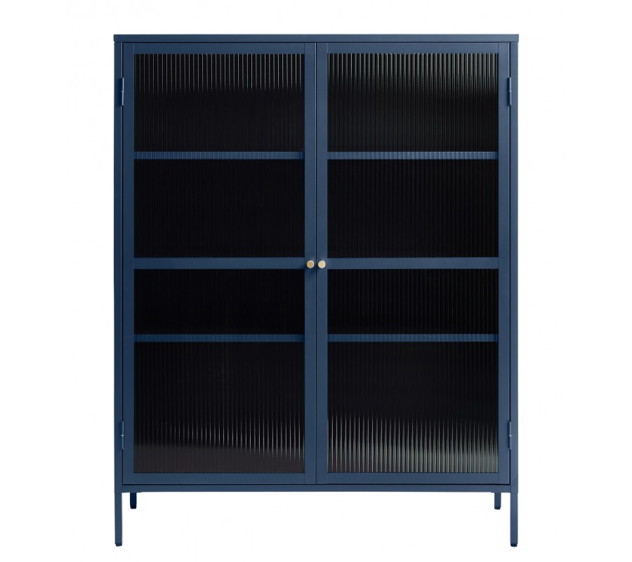 Dvířka jsou vyplněna strukturovaným tvrzeným bezpečnostním sklem, které jemně rozptyluje světlo a zároveň částečně zakrývá obsah uvnitř. Tento detail dodává nábytku sofistikovaný vzhled a zároveň zachovává praktičnost úložného prostoru. Za dvoukřídlými dvířky se nachází úložný prostor rozdělený na čtyři policová místa s rozdílnou výškou, která umožňují flexibilní uložení knih, dekorací, dokumentů nebo nádobí. Uprostřed dvířek jsou umístěny kulaté kovové úchytky ve zlaté barvě, které vytvářejí jemný kontrast s tmavomodrou konstrukcí a dodávají nábytku elegantní akcent.