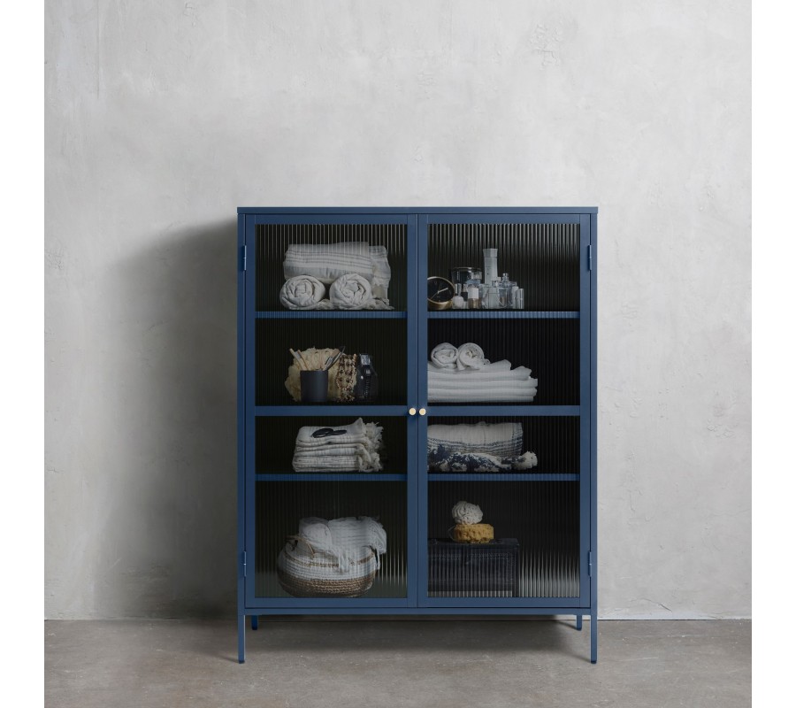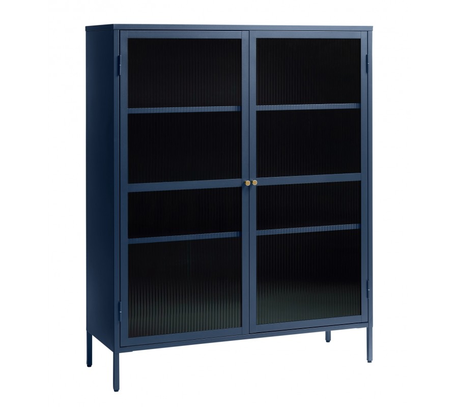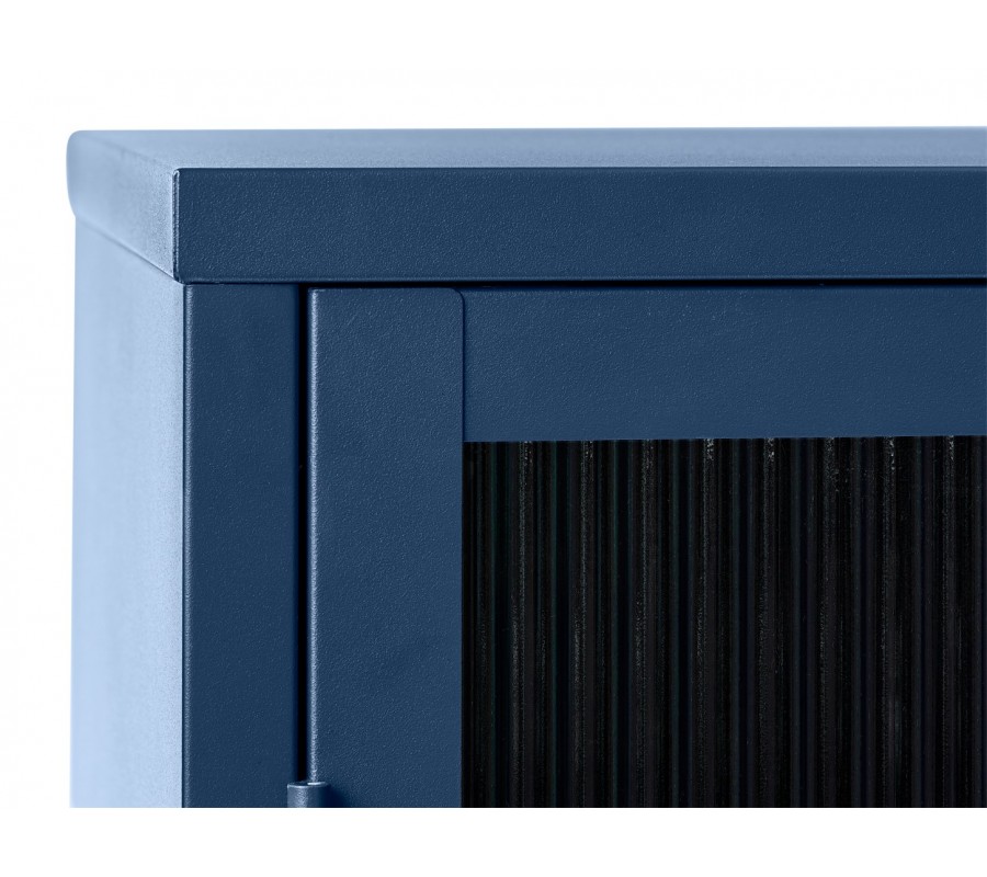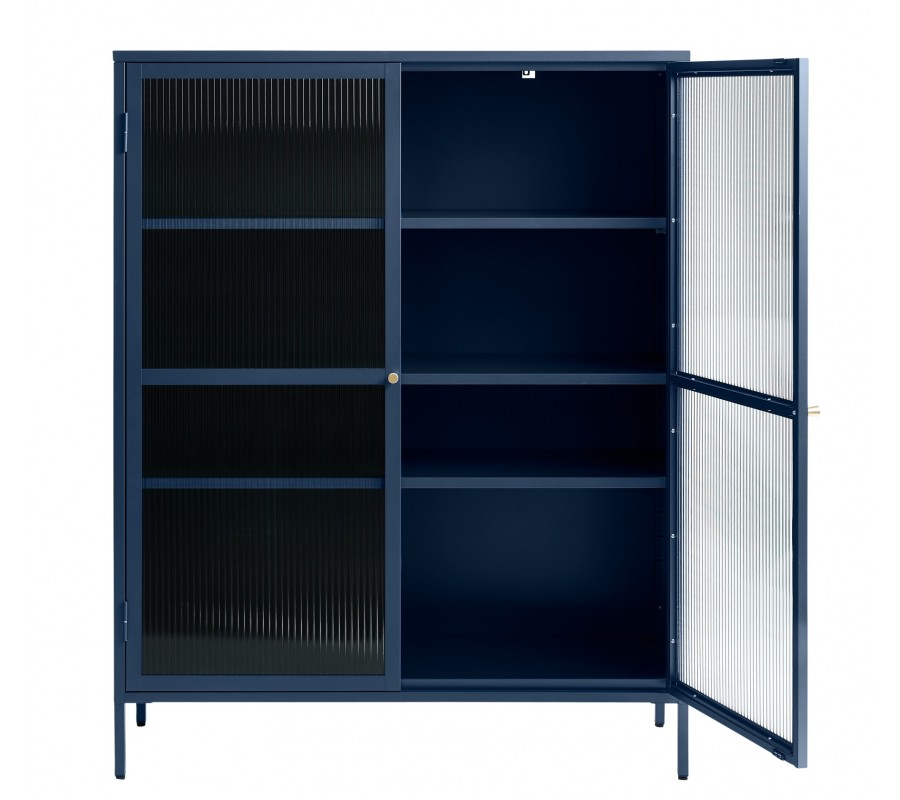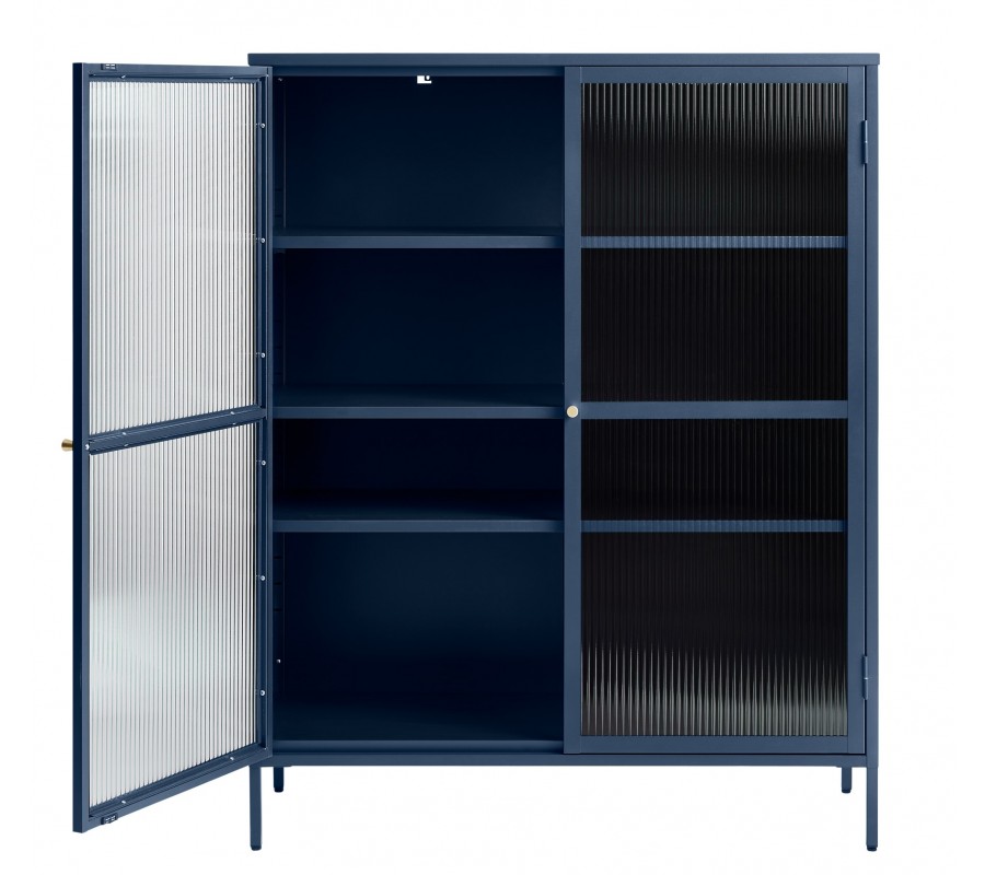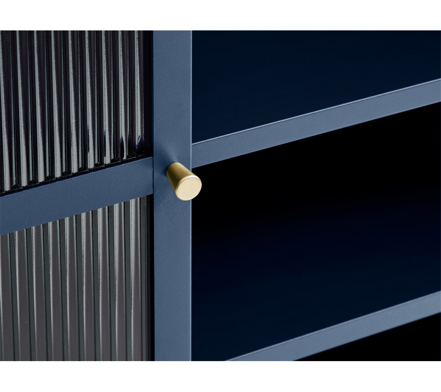 Dvířka jsou vyplněna strukturovaným tvrzeným bezpečnostním sklem, které jemně rozptyluje světlo a zároveň částečně zakrývá obsah uvnitř. Tento detail dodává nábytku sofistikovaný vzhled a zároveň zachovává praktičnost úložného prostoru. Za dvoukřídlými dvířky se nacházejí tři police, které poskytují dostatek místa pro knihy, dekorace, dokumenty nebo nádobí. Uprostřed dvířek jsou umístěny kulaté kovovéúchyty ve zlaté barvě, které vytvářejí jemný kontrast stmavě modrou konstrukcí a podtrhují moderní industriální styl nábytku.