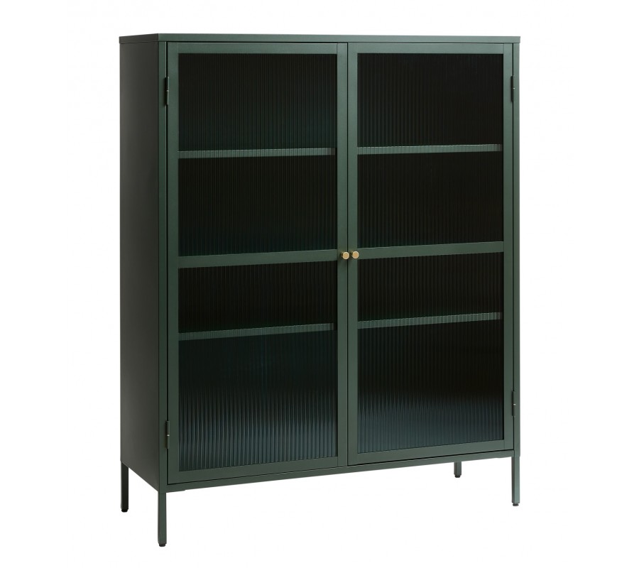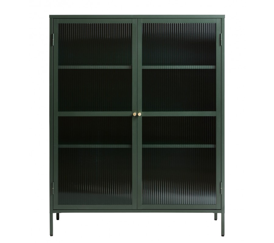 Moderní industriální zelená dvoudveřová knihovna Farver se skleněnou průhlednou strukturovanou výplní s policí 140 cm