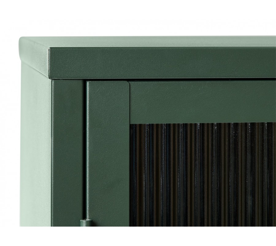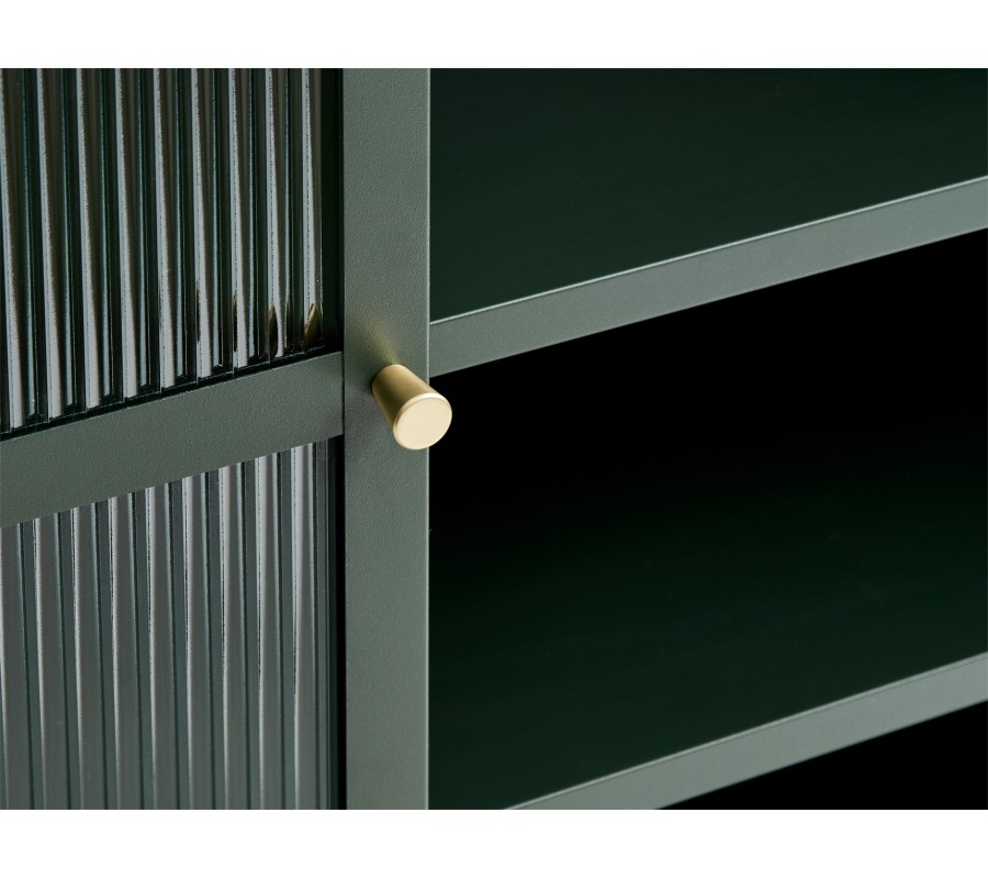 Dvoukřídlá dvířka jsou vyplněna strukturovaným tvrzeným bezpečnostním sklem s jemnou drážkovanou (žebrovanou) strukturou, které rozptyluje světlo a zároveň částečně zakrývá obsah uvnitř. Tento detail dodává nábytku sofistikovaný industriální vzhled. Ve středu dvířek se nacházejí kulaté kovové úchyty ve zlaté barvě, které vytvářejí jemný kontrast se zelenou konstrukcí a dodávají nábytku elegantní akcent.