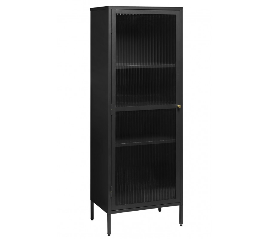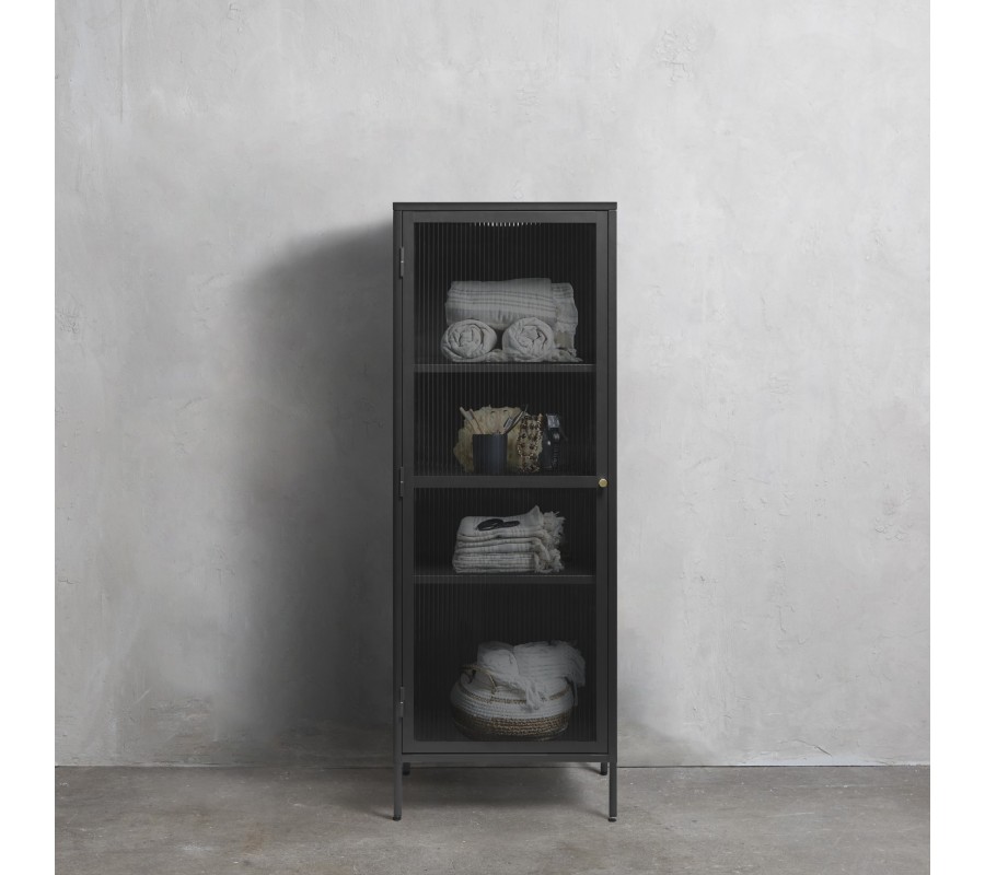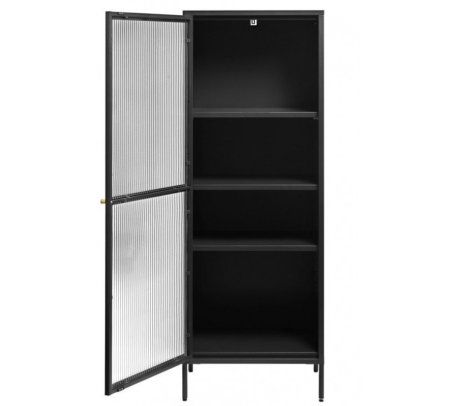 Jednodveřové provedení je doplněno o skleněnou výplň z vrubkovaného skla, která vytváří zajímavý vizuální efekt. Rýhované sklo jemně rozptyluje světlo a zároveň decentně zakrývá obsah, čímž působí uklizeno a elegantně. Vnitřní prostor je rozdělen třemi policemi a vytváří tak čtyři odkládací plochy s různou výškou, které poskytují dostatek místa pro knihy, dekorace, sklo nebo nádobí.