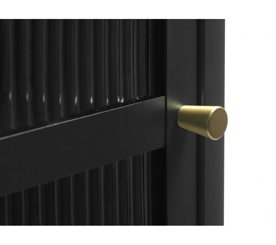 Moderní knihovna Farver v černé barvě s jedněmi skleněnými vroubkovanými dvířky a čtyřmi policemi se zlatou úchytkou 160 cm
