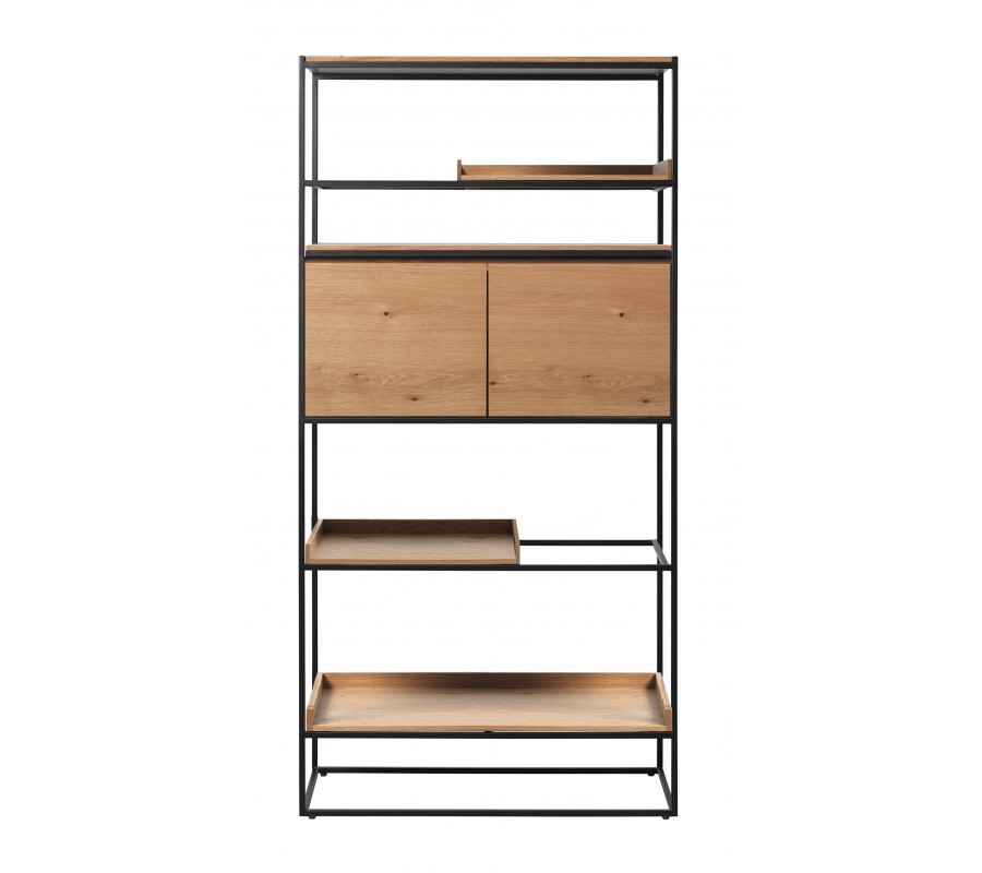 Luxusní industriální regál Soldo v kombinaci světlého dubu a černého kovu se dvěma dvířky a čtyřmi policemi 181 cm