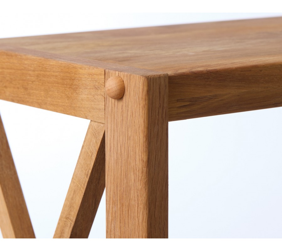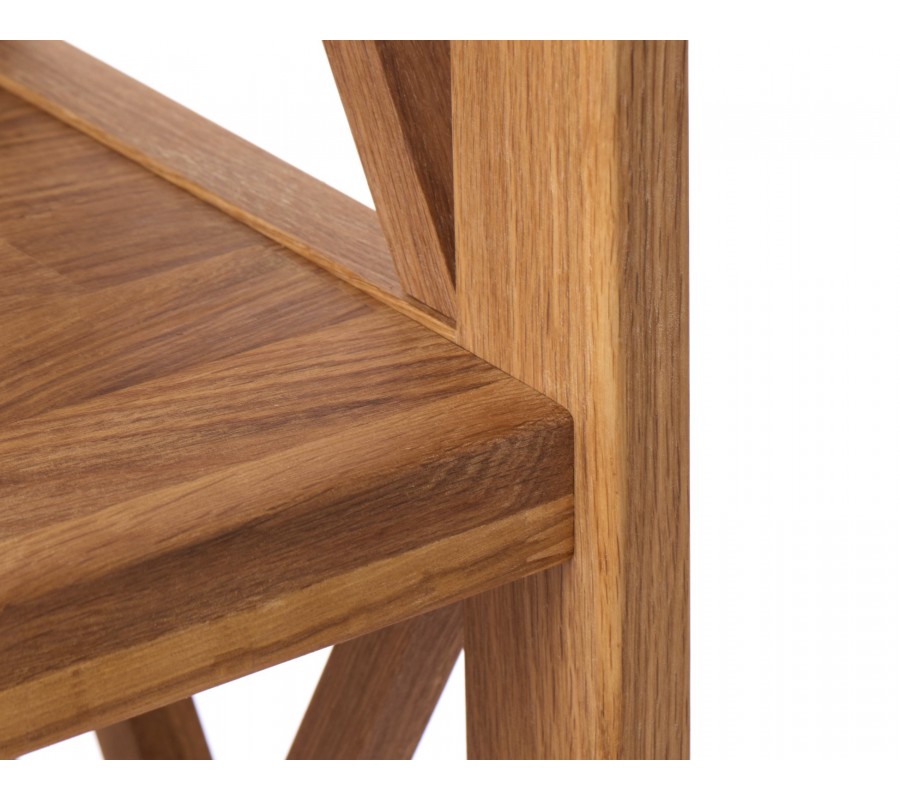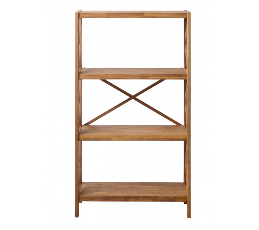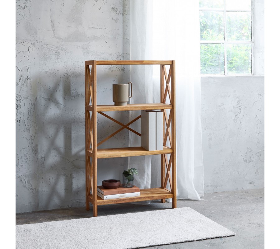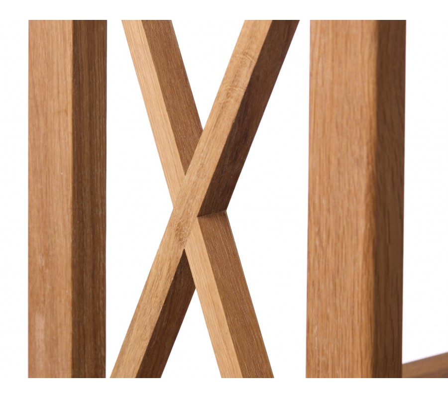 Tři obdélníkové police jsou po stranách propojeny stabilním rámem, který přechází do nízkých hranatých nožiček. Každou polici doplňují boční výztuhy ve tvaru písmene X, které zpevňují konstrukci a zároveň dodávají nábytku venkovský akcent. Vrchní deska poskytuje další prostor pro odkládání dekorací, knih či rostlin. Zadní strana zůstává otevřená, přičemž ji doplňují další dva křížové prvky na úrovni spodní a vrchní police.