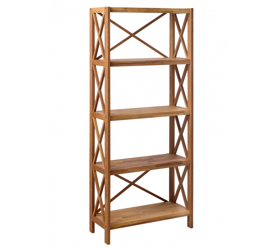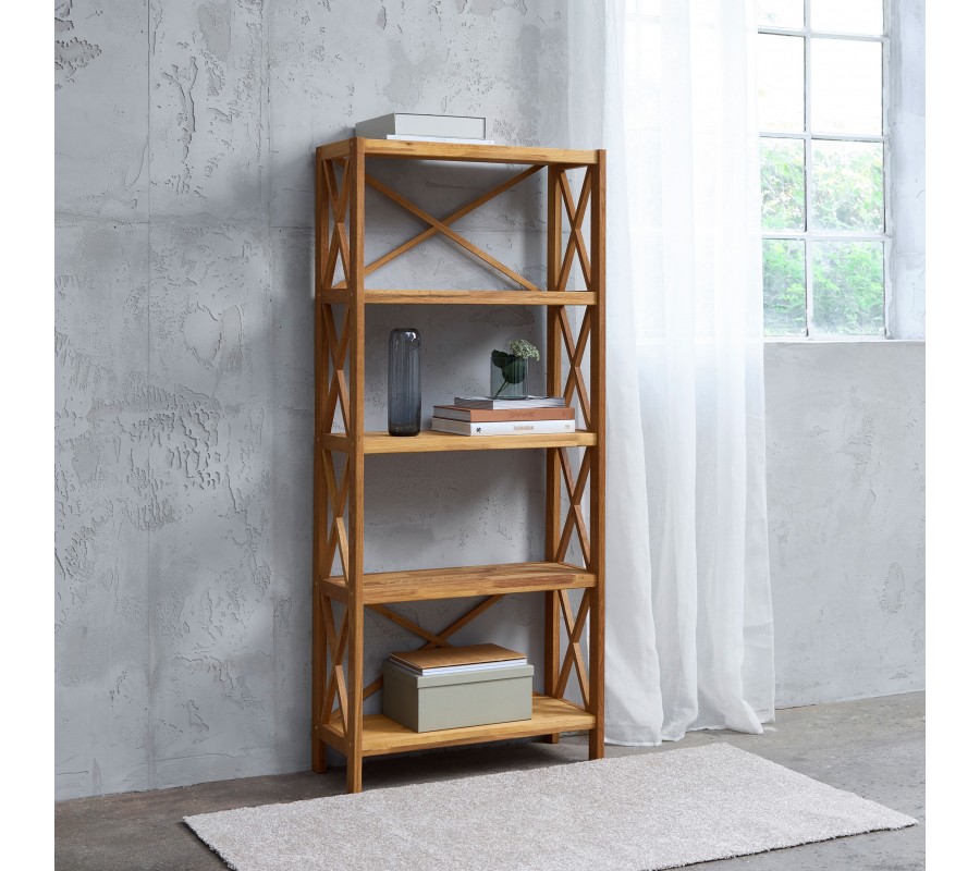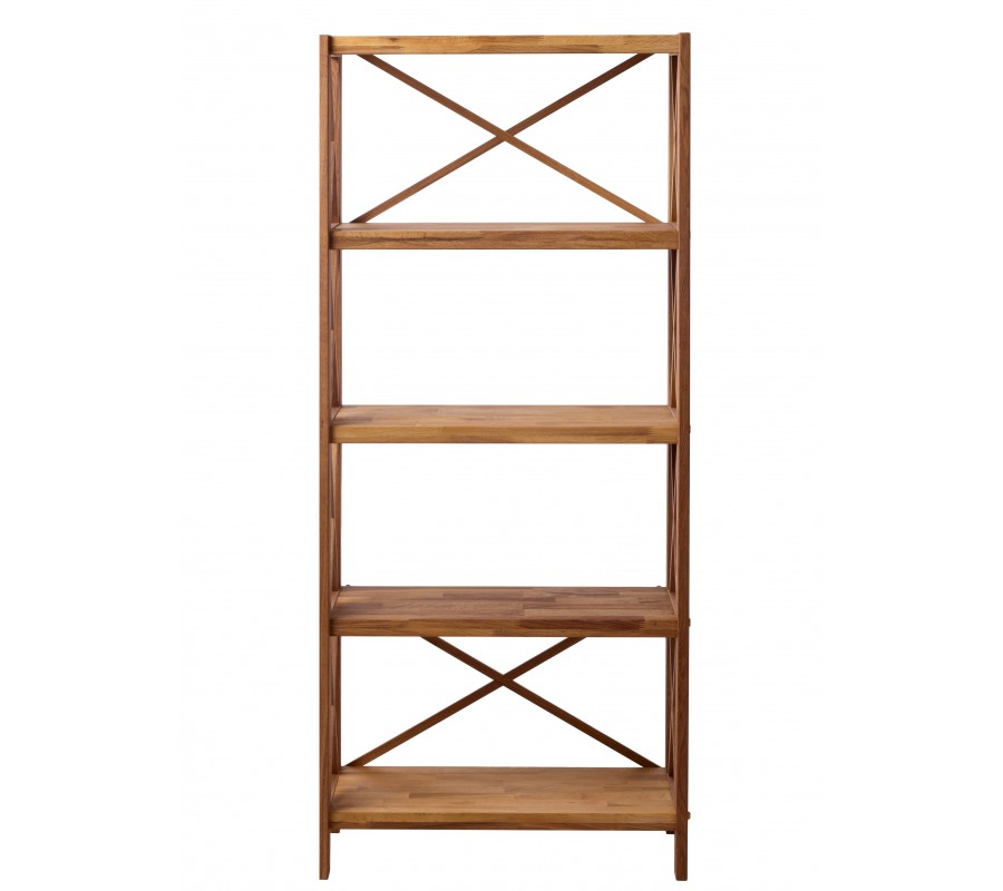 Skandinávský masivní regál Lixi se čtyřmi policemi a výztuhami ve tvaru X s přírodní hnědé barvě dubového dřeva 161 cm