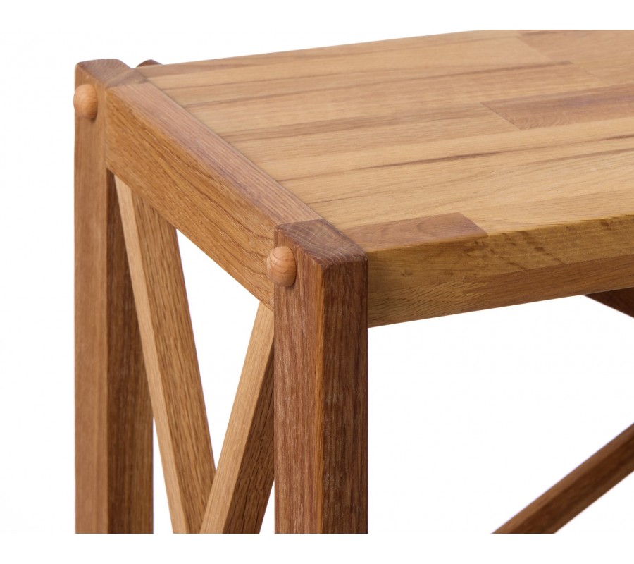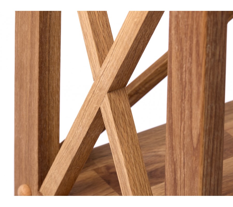Čtyři obdélkové police jsou po stranách spojeny pevným rámem, který plynule přechází do nízkých hranatých nožiček. Každou úroveň doplňují boční výztuhy ve tvaru písmene X, které zpevňují konstrukci a zároveň dodávají nábytku jemný venkovský nádech. Vrchní část je zakryta a tato plocha nabízí dodatečný odkládací prostor, například pro dekoraci či živou rostlinu. Zadní část zůstává otevřená a pro lepší stabilitu ji doplňují další dva křížové prvky na úrovni spodní a vrchní police.