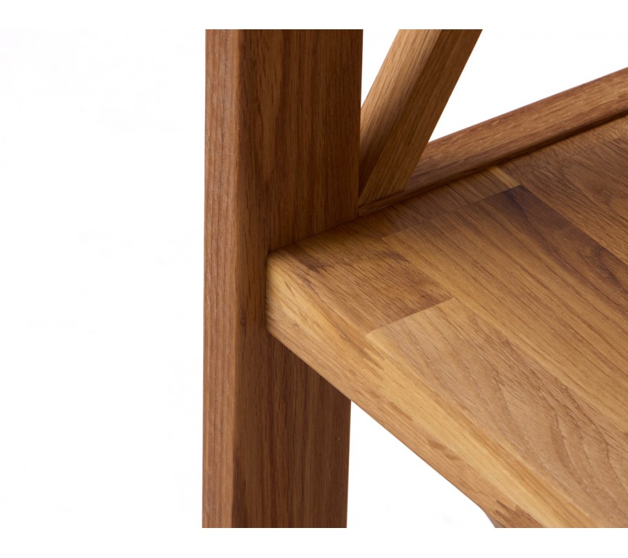 Jeho minimalistický tvar stojí na rovných liniích a vyvážené geometrii. Otevřená konstrukce působí snadno a vzdušně, díky čemuž se hodí nejen ke stěně, ale také jako nenápadný dělící prvek v prostoru. Světlé hnědé dubové dřevo s pravidelnou kresbou letokruhů podtrhuje přirozený vzhled, typický pro skandinávský styl.