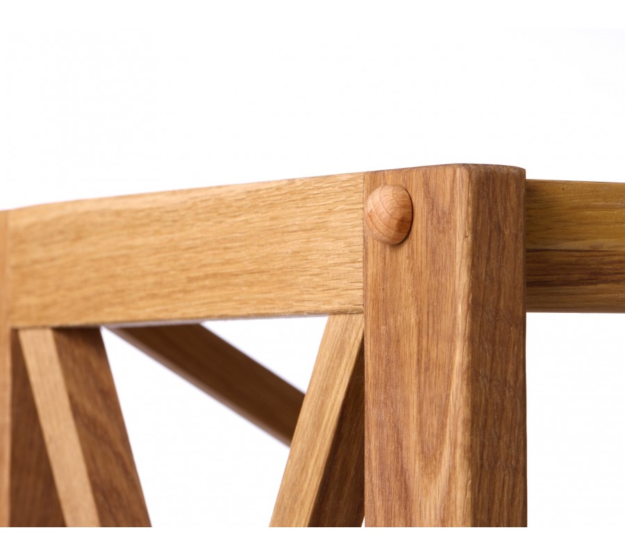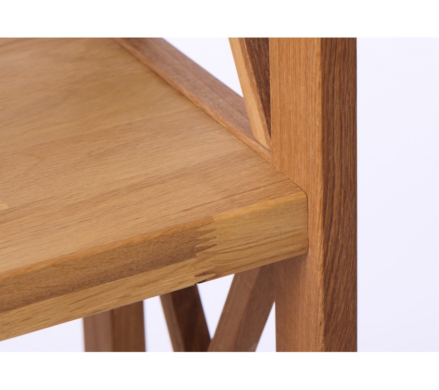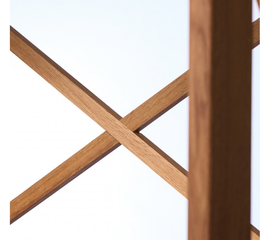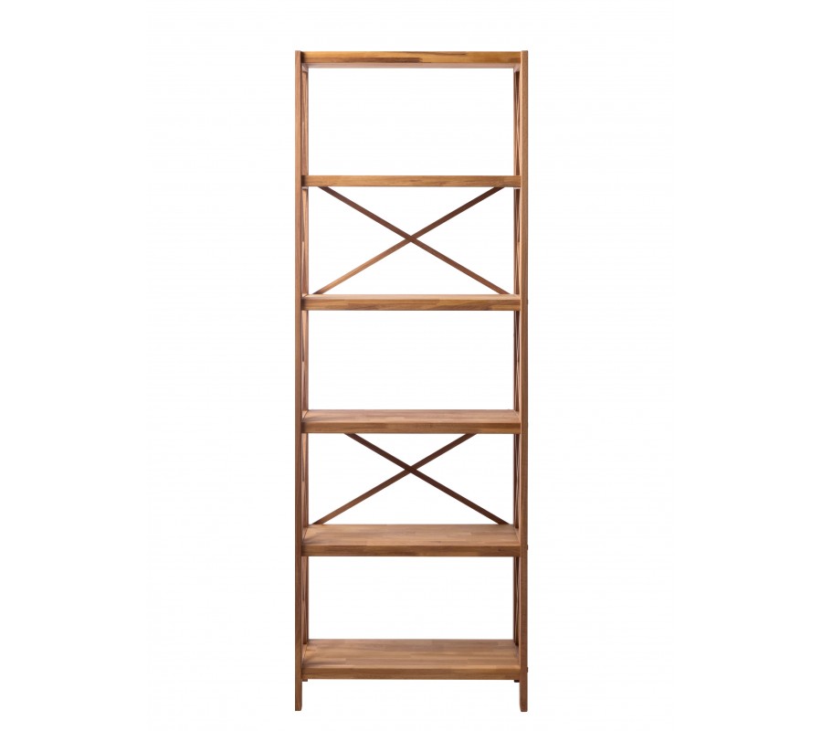 Pět obdélníkových polic je na bocích propojených rámem, přecházejícím ve spodní části do nízkých hranatých nožiček. Každý policový segment doplňuje na stranách konstrukční prvek ve tvaru X, který zároveň působí tradičně a dodává nábytku venkovský charakter. Vrchní část je kryta a nabízí dodatečnou odkládací plochu. Zadní strana je otevřená a doplňují ji další dvě křížové výztuhy na úrovni druhé a čtvrté police.