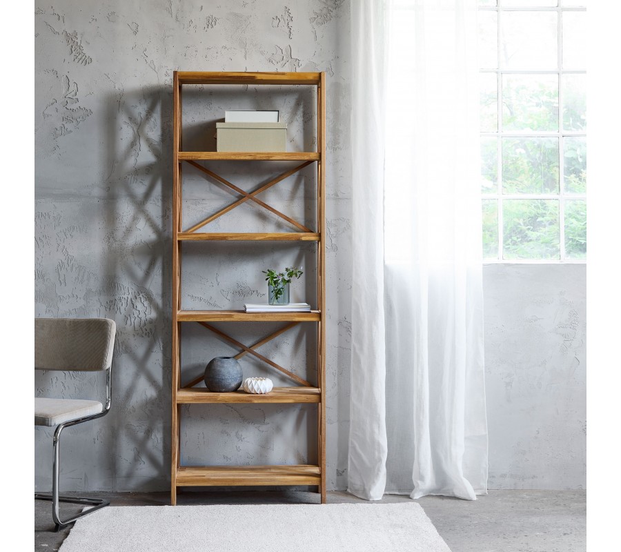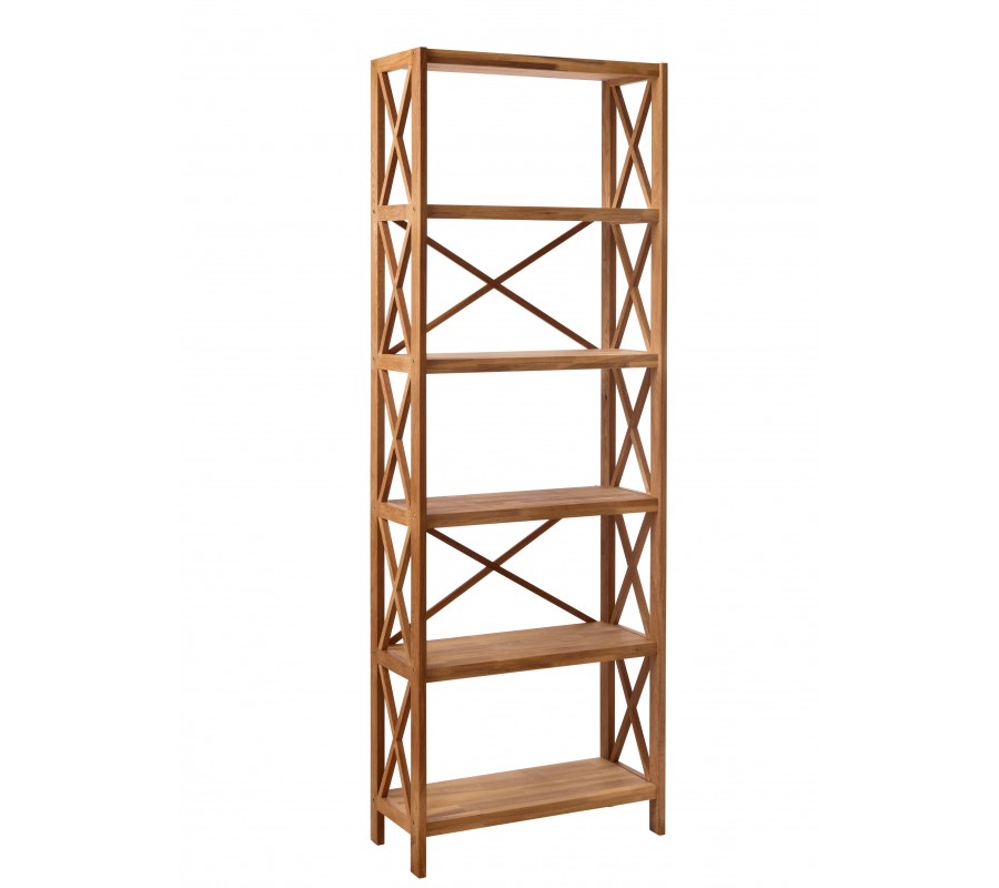 Venkovský masivní regál Lixi s pěti policemi a křížovými výztuhami z dubového dřeva v přírodní hnědé barvě 198 cm