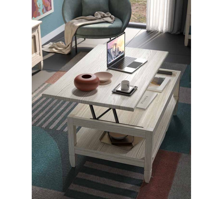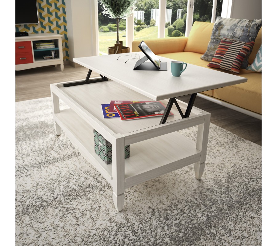 Konferenční stolek má obdélníkovou vrchní desku, pod kterou je umístěn nízký úložný prostor. Otevírá se jejím nadzvednutím pomocí pohyblivého kovového mechanismu, diskrétně umístěného na stranách. Na rozích se nacházejí čtyři hranaté nožičky, které podtrhují moderní lineární siluetu. V jejich spodní části je upevněna velká otevřená police, poskytující dodatečnou odkládací plochu. Konce nožiček jsou pod policí zúžené a na delších hranách je doplňuje elegantní lišta s vyřezávaným dvouobloukovým zdobením, která dodává nábytku půvabný venkovský výraz.