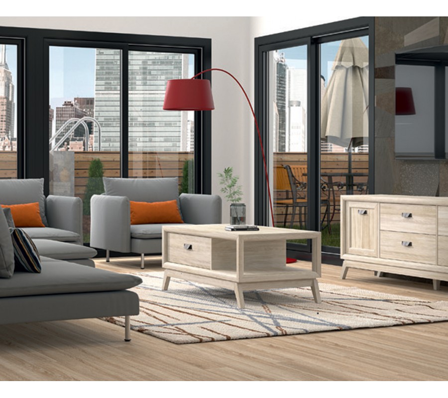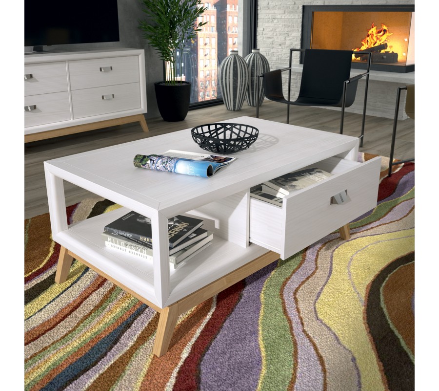 Konferenční stolek má obdélníkový korpus, položený na podstavě se zešikmenými nožičkami v art deco stylu. Geometričnost designu podtrhují i zvýrazněné vystouplé hrany úložného prostoru. Pod hladkou vrchní deskou je umístěna zásuvka s kovovou úchytkou, která zabírá dvě třetiny šířky stolku. Zbývající prostor je otevřený a poskytuje další odkládací plochu v podobě police.