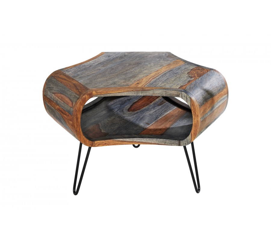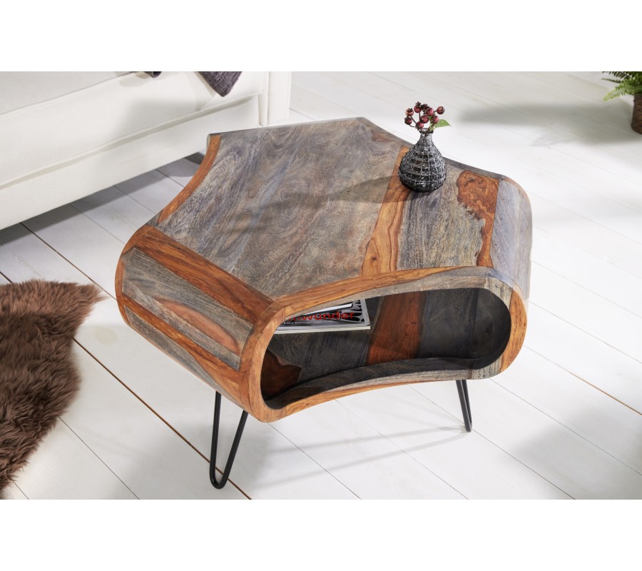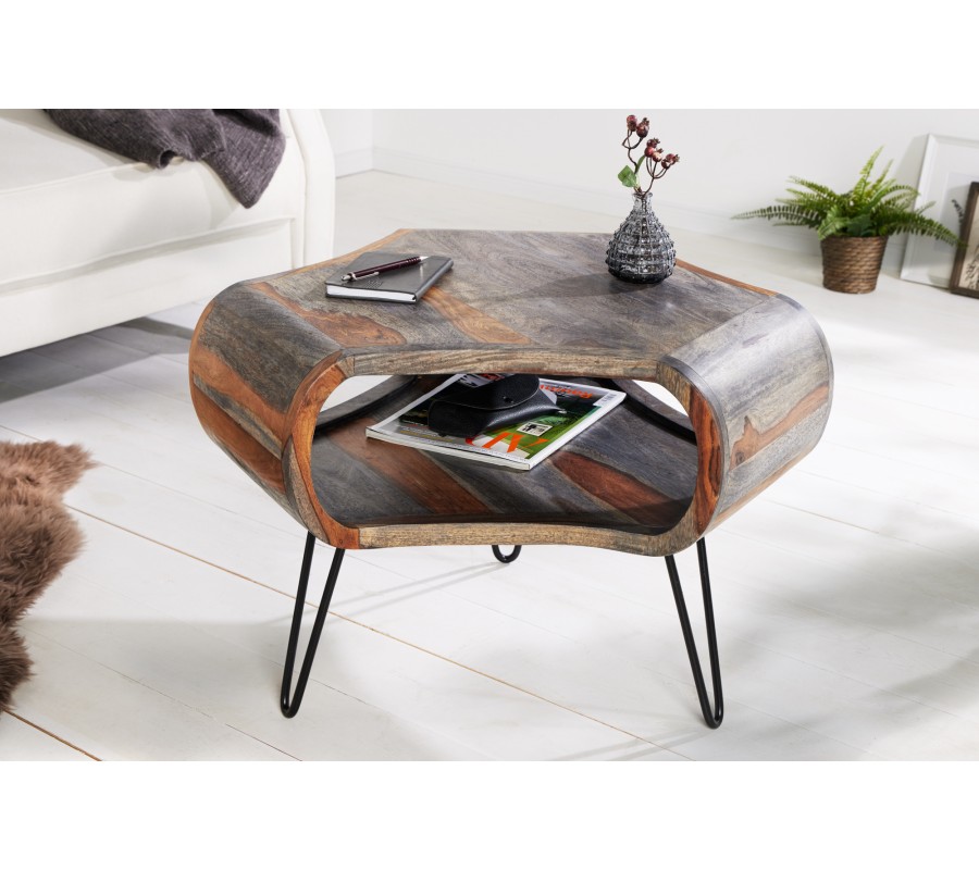 Masivní retro konferenční stolek Spin III s oblými řezanými tvary ze sheesham dřeva v hnědošedém provedení 70cm