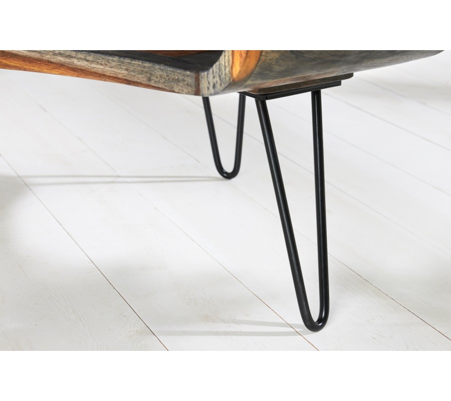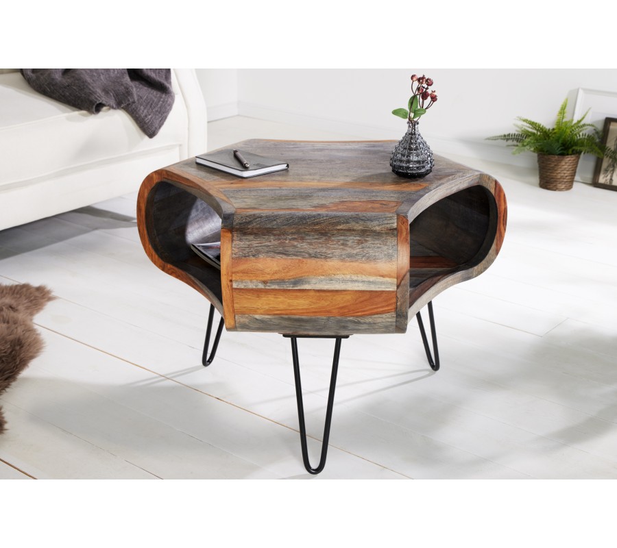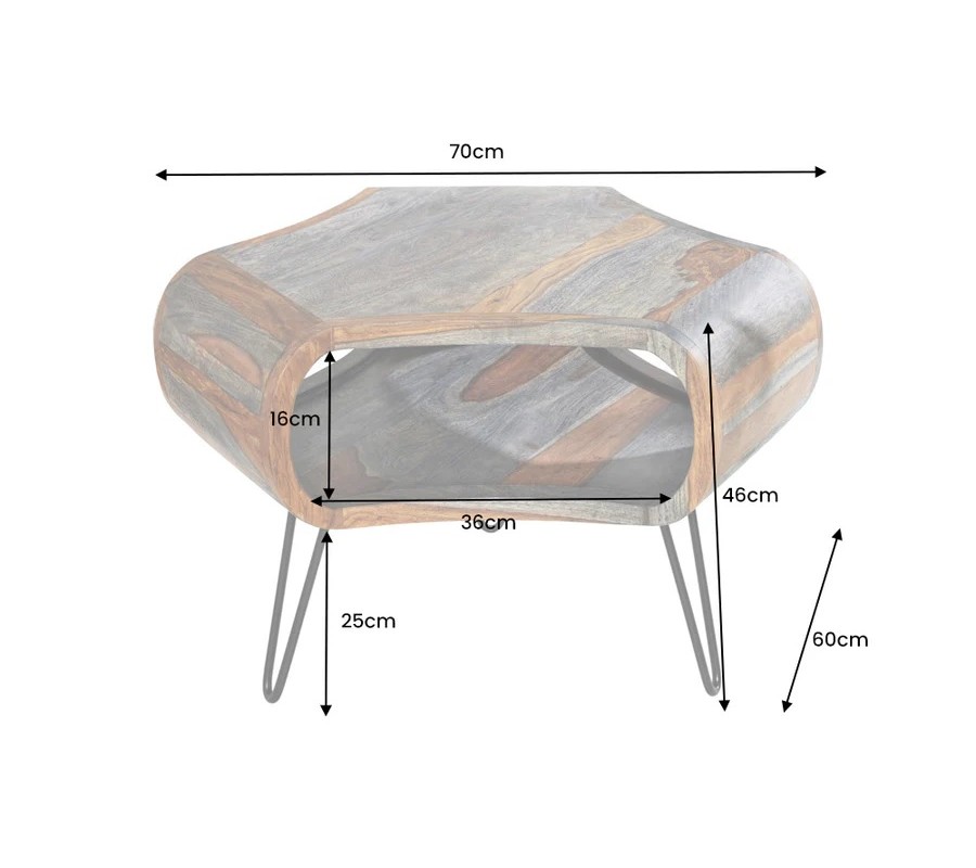 Designový konferenční stolek Spin představuje unikátní a neotřelý kousek nábytku, který je ideální pro milovníky masivního dřeva a retro stylu. Tento stolek se vyznačuje svým originálním a neobvyklým tvarem, který je dále zvýrazněn zaobleným designem s řezanými boky. Tento specifický tvar nejen dodává stolku vizuální atraktivitu, ale také nabízí praktický odkládací prostor, který je ideální pro uschování drobných předmětů, časopisů nebo knih. Stolek je vyroben z kvalitního masivního dřeva sheesham, známého svojí odolností a jedinečnou texturou. Na dřevě můžeme obdivovat jeho zajímavou a přitažlivou kresbu, která každý kousek činí jedinečným. Přírodní hnědá barva dřeva, která je doplněna o šedé zabarvení, vytváří teplý a přívětivý vzhled, který krásně vyniká zejména ve světlejších interiérech. Tento barevný odstín poskytuje stolku eleganci a sofistikovanost a zároveň jej činí všestranným kouskem, který se hodí do mnoha dekorativních stylů. Konferenční stolek Spin je tedy nejen vizuálně přitažlivý, ale také praktický a funkční. Jeho jedinečný tvar a kombinace materiálů dělají tento stolek ideálním doplňkem pro obývací pokoje zařízené v retro nebo industriálním stylu.