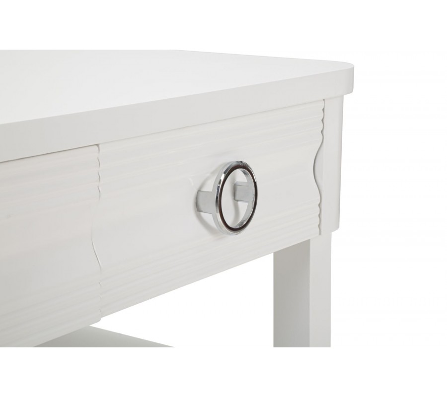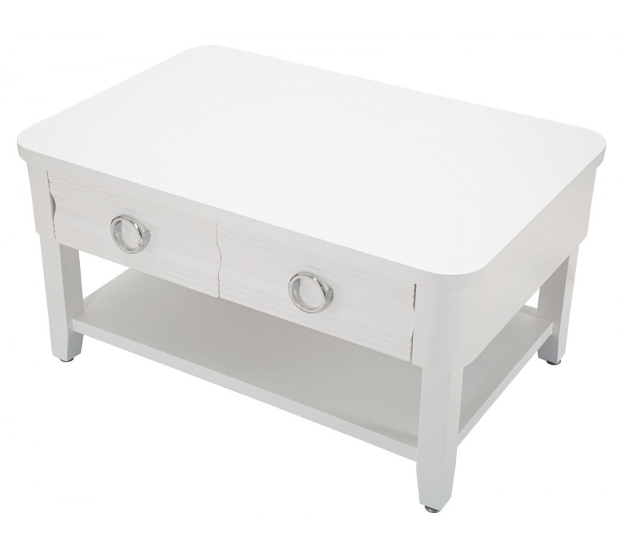 Konferenční stolek je vyroben z kombinace masivního a dýhovaného dřeva. Povrch pokrývá nátěr v bílé barvě s vysokým leskem, který v kombinaci s chromovým provedením kovových částí podtrhuje moderní charakter nábytku.