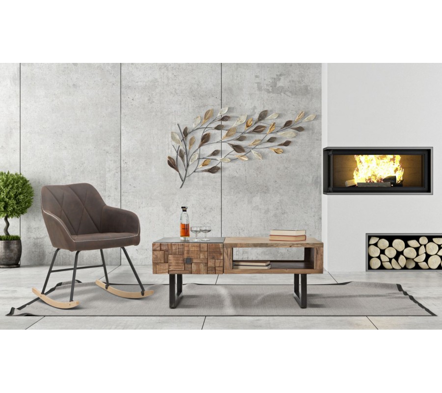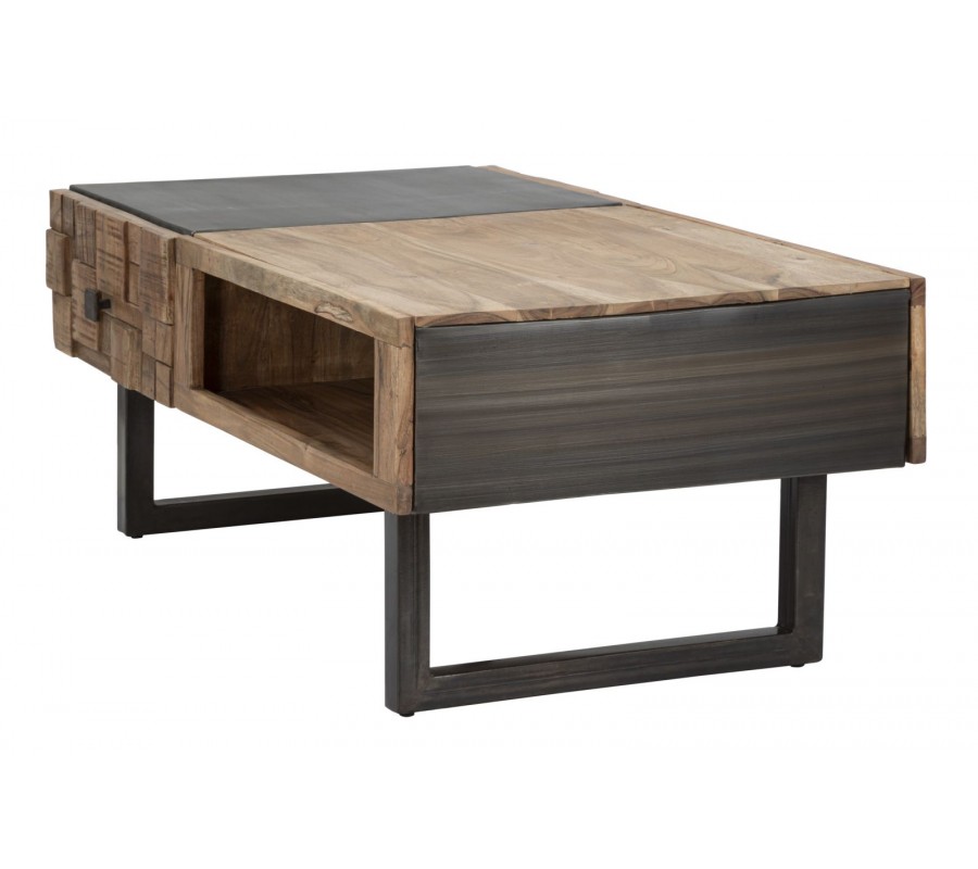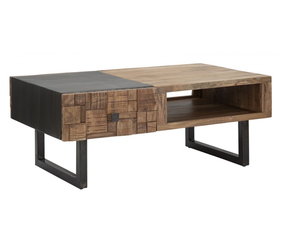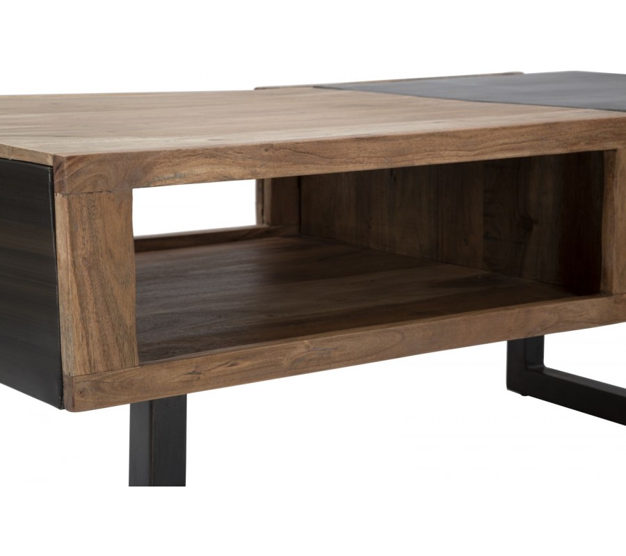 Stolek stojí na kovových nožičkách, které jsou černé, čímž zajišťují stabilitu a pevnost. Kombinace dřeva a kovu je ideální pro moderní i industriální interiéry, přičemž design stolku je nadčasový a elegantní.