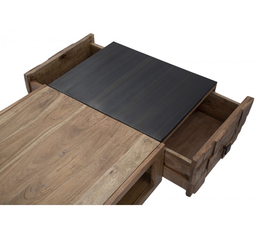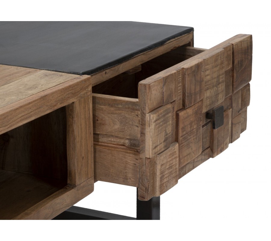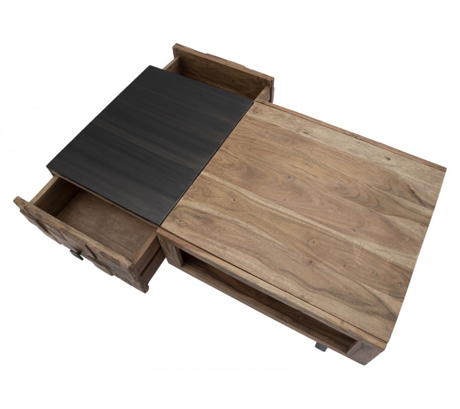 Stolek je vybaven zásuvkami na obou stranách, které poskytují praktický úložný prostor pro drobnosti. Na pravé straně se nachází police pro další uložení předmětů nebo dekorací. Zásuvky mají jednoduché kovové úchyty, které dokonale ladí s industriálním designem celého stolku.
