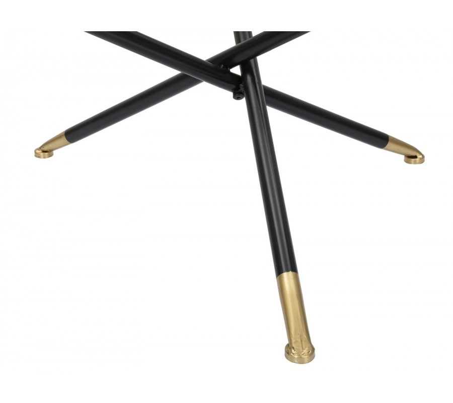 Podnož tvoří tři překřížené kovové nožičky v černé matné barvě, které dodávají stabilitu a zároveň. Konce nožiček jsou zdobeny zlatými detaily s kulovým zakončením, čímž stolek nabývá luxusní nádech ve stylu