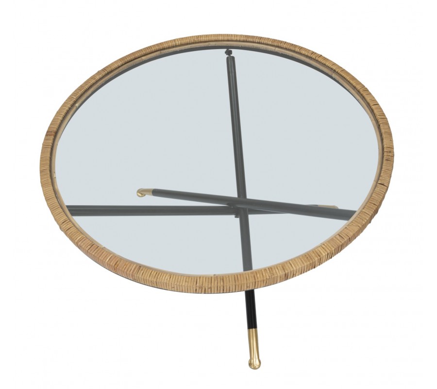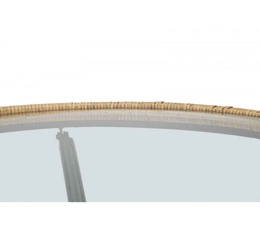 Moderní kulatý konferenční stolek Pavone s vrchní skleněnou deskou s ratanovým rámem s překříženými černými nožičkami 80 cm
