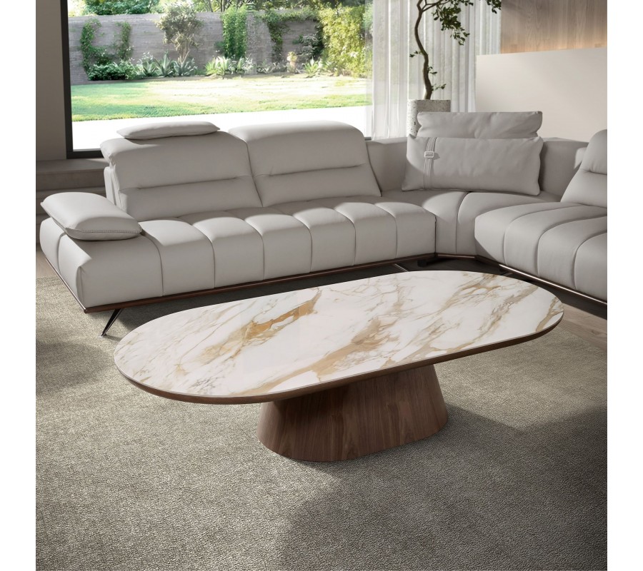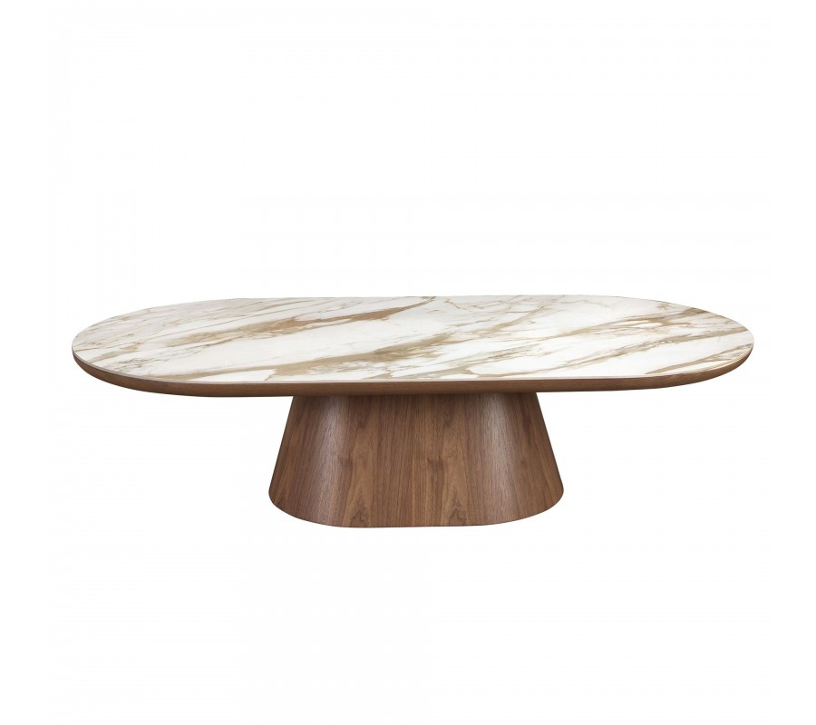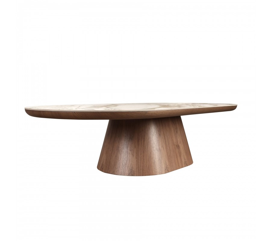 Stolek stojí na mohutné oválné noze z přírodní ořechové dýhy, která je v horní části užší a směrem dolů se rozšiřuje. Tento detail nejenže zajišťuje stabilitu, ale zároveň zdůrazňuje jeho avantgardní a moderní charakter. Robustná konstrukce a plynulé zaoblené linie vytvářejí harmonický kontrast mezi jemností porcelánové vrchní plochy a přírodním vzhledem dřeva.