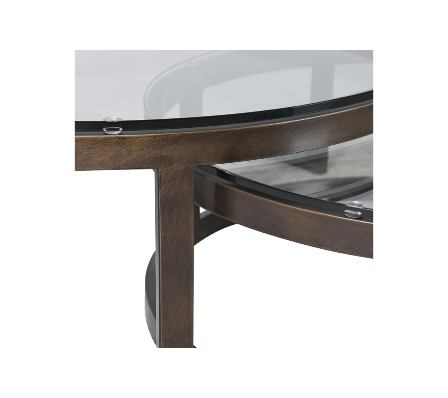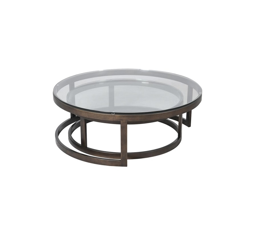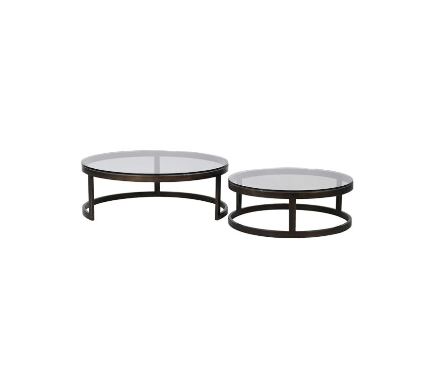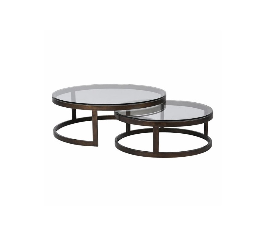 Industriální kulatá sada konferenčních stolků Riven je nadčasovým řešením do moderního interiéru. Skládá se z většího stolku o výšce 36 cm a průměru 100 cm a menšího stolku o výšce 30 cm a průměru 80 cm. Oba mají pevné kovové konstrukce v mosazné barvě s jemnou patinou a vrchní průhledné skleněné desky, které dodávají prostoru lehkost.