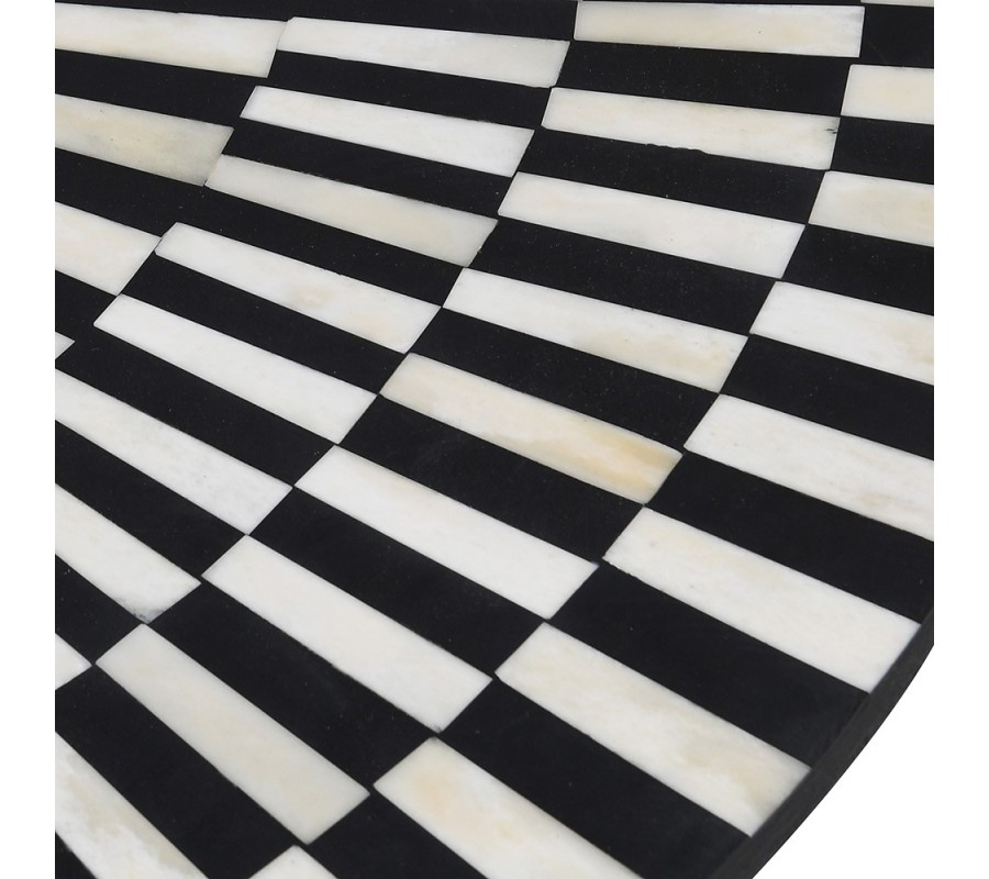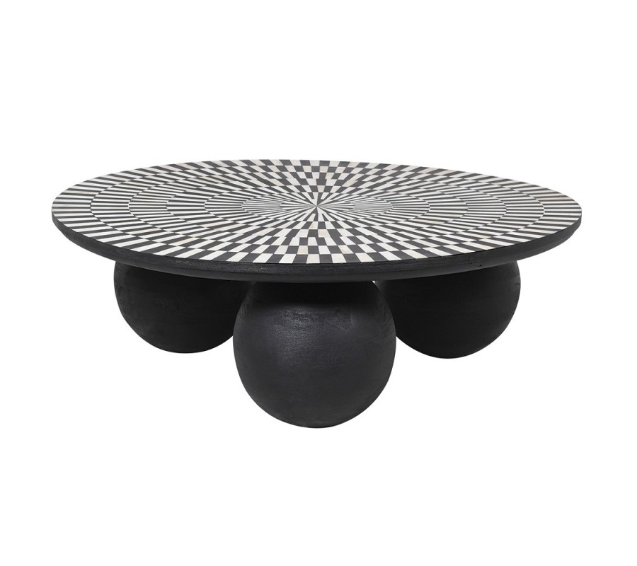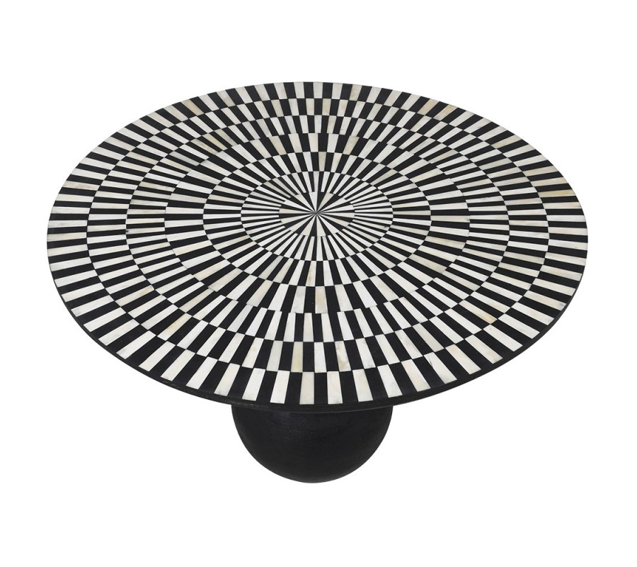 Luxusní art deco konferenční stolek Siciliano je výjimečný designový kousek, který spojuje umělecké řemeslo a moderní optický efekt. Vyroben je z mangového dřeva v černém provedení, přičemž jeho vrchní deska je dekorována technikou bone inlay - vykládáním obrazců z menších kousků kostí. Preciznígeometrický vzor v černé a bílé barvě vytváří optickou iluzi točení či pohybu a je uspořádán do soustředných kruhů, které zvýrazňují dynamiku designu.