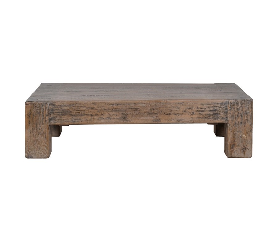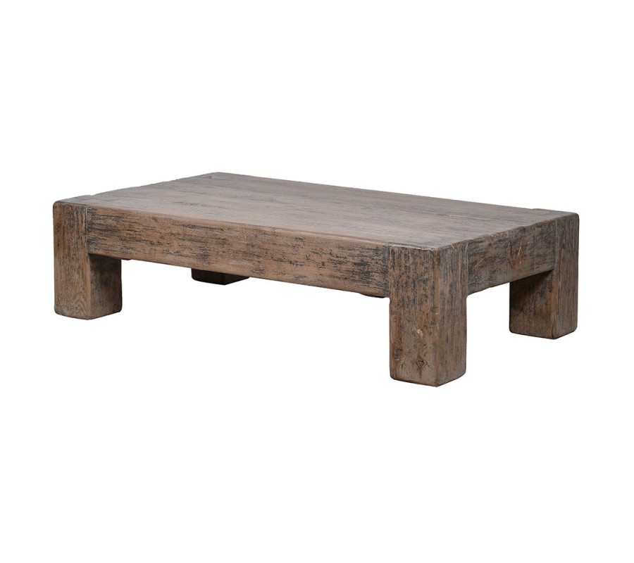 Stolek má mohutnou siluetu, v níž dominují minimalistické rovné linie. Hrubá vrchní deska je umístěna na čtyř mohutných kvádrových nožičkách. Zajímavým konstrukčním detailem jsou viditelné spoje na povrchu, kde tvarované části vrchní desky přesně zapadají do výřezů na nožičkách. Tyto přiznané prvky v kombinaci se zestárlým efektem dřeva dodávají nábytku surový naturální vizuál.