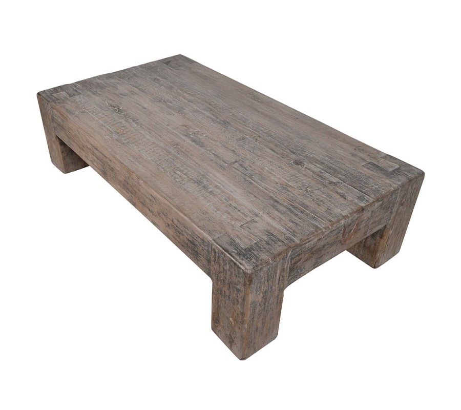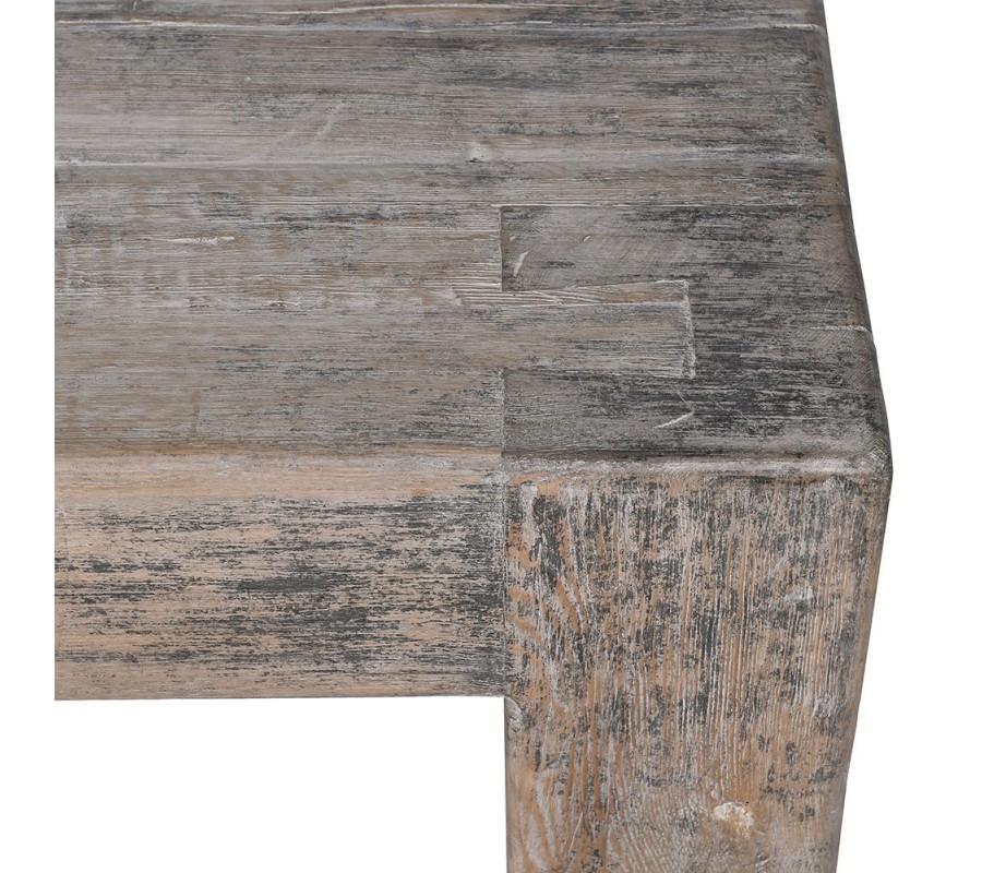 Stolek je vyroben z recyklovaného masivního dřeva, které dodává každému kusu unikátní strukturu. Má přírodní šedohnědou barvu a povrch je upraven patinou, která zdůrazňuje kresbu dřeva. Různé nedokonalosti ve struktuře, jako feny či uzly přidávají nábytku estetickou hodnotu a zvyšují jeho originalitu.
