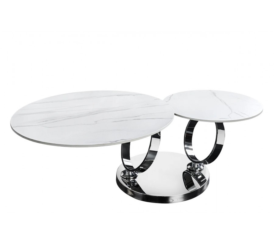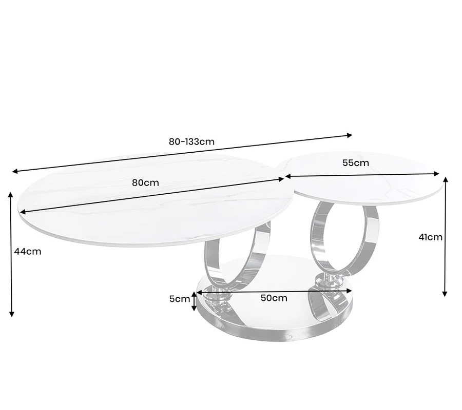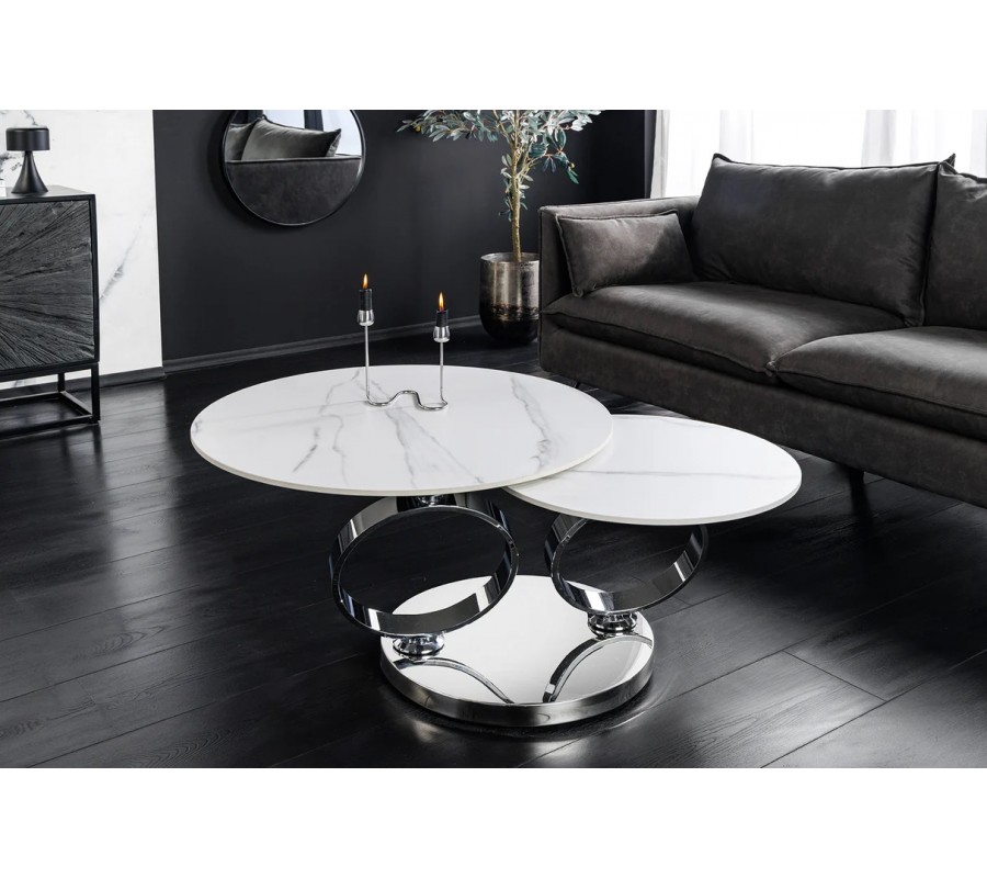Glamour mramorový bílý konferenční stolek Delin se dvěma otočnými kulatými prkny a chromovanou podstavou 80-133 cm