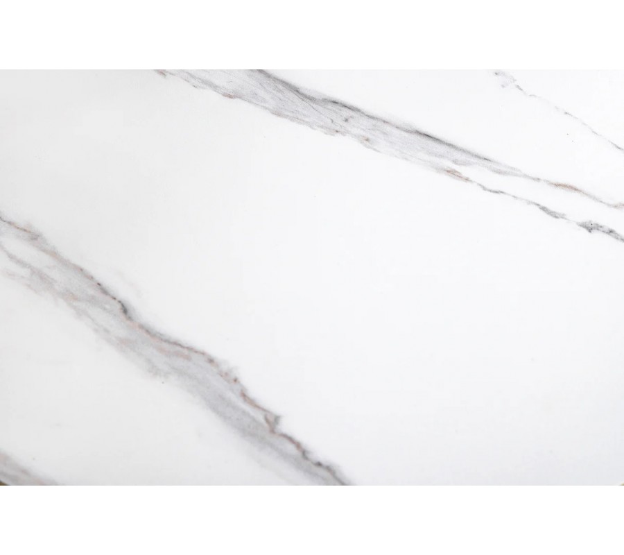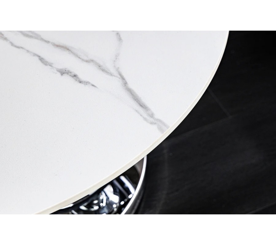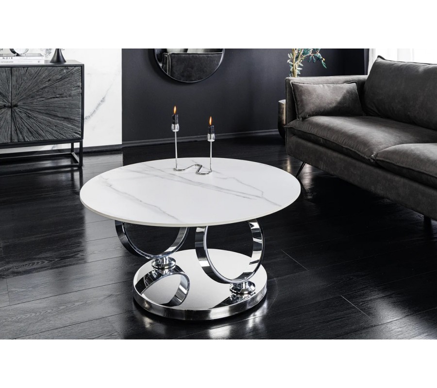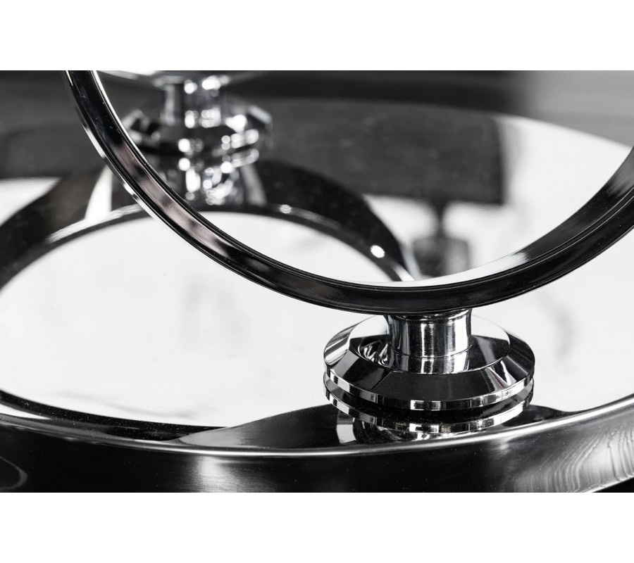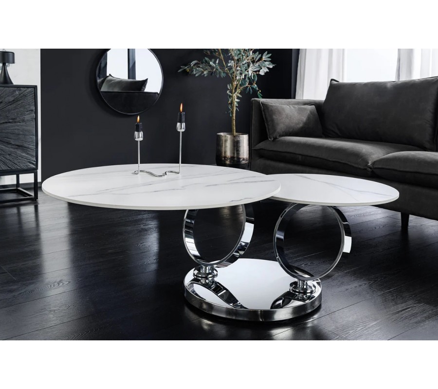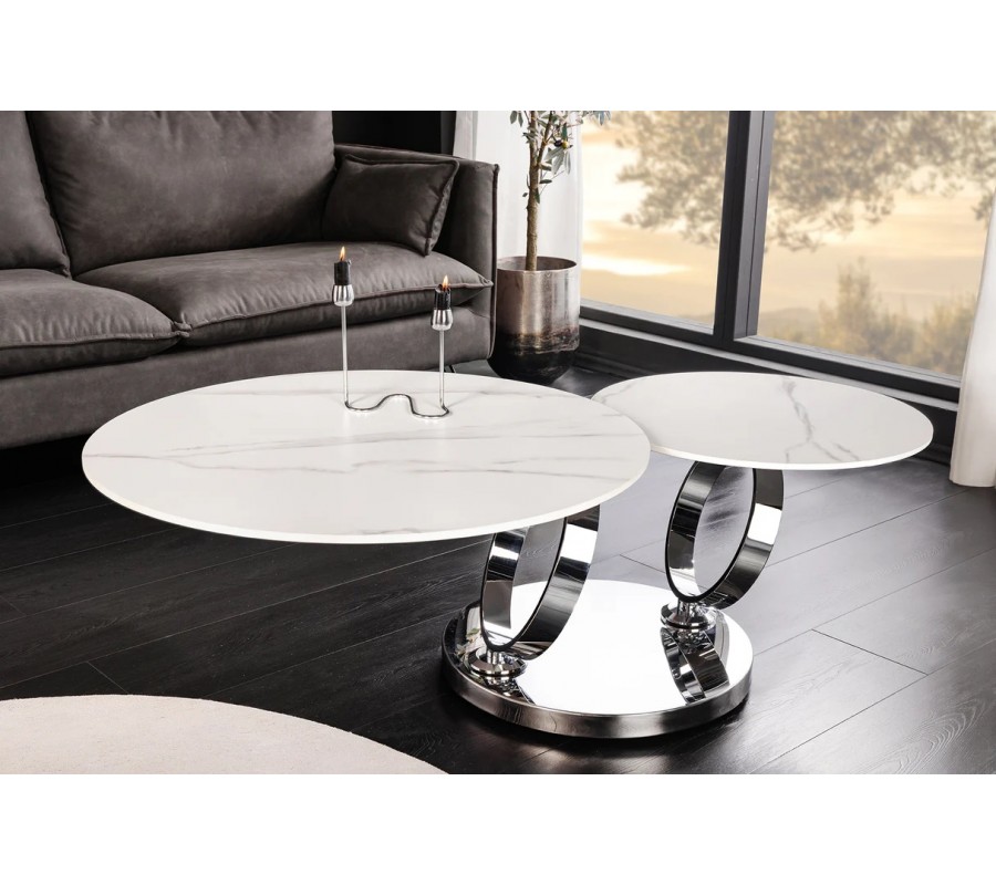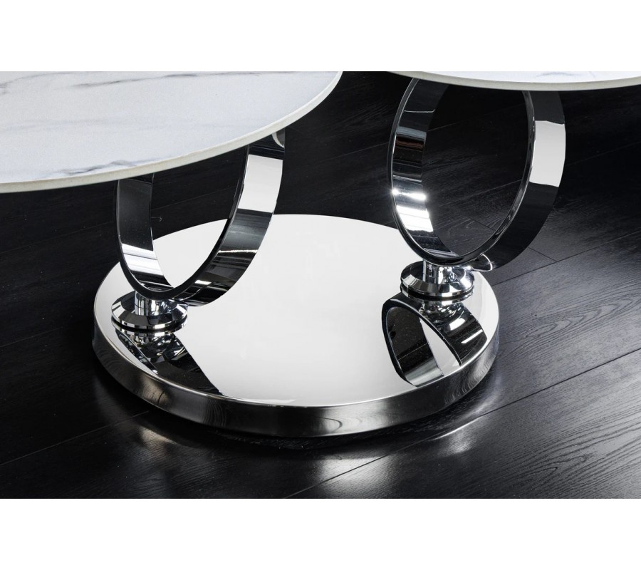 Stolek je postaven na kulaté chromované kovové podstavě, ze které vyrůstají dva elegantní kovové kruhy, sloužící jako nosná konstrukce pro vrchní desky. Na nich jsou umístěny dvě kulaté keramické desky s mramorovým designem v bílé barvě s šedými žilkami, které působí mimořádně luxusně a zároveň vzdušně. Větší deska má průměr 80 cm, menší 55 cm.