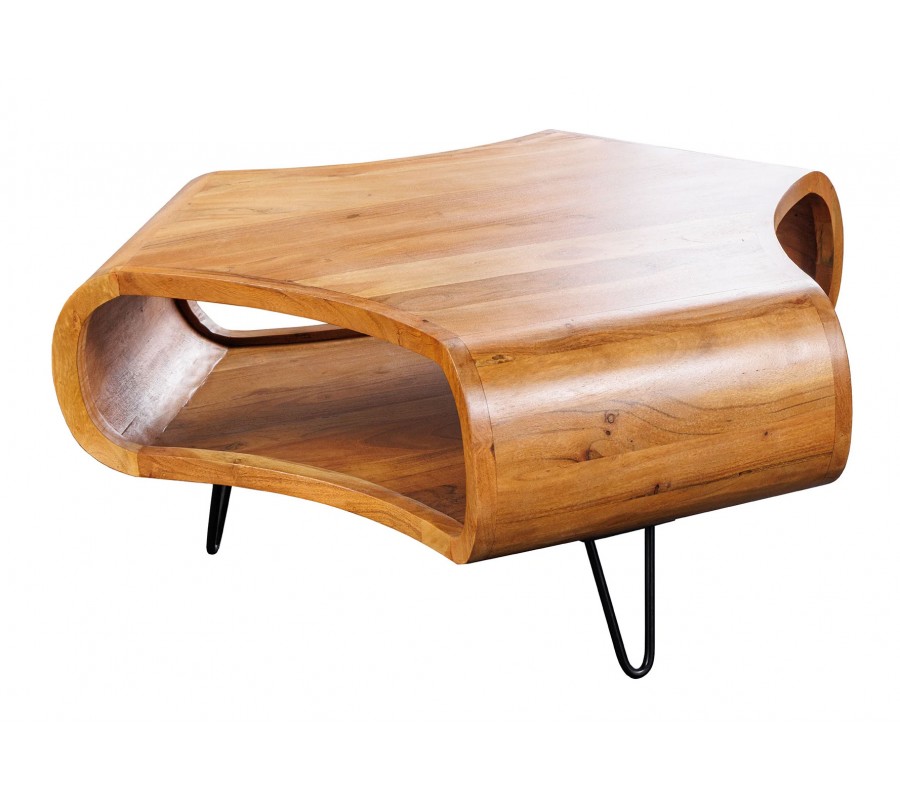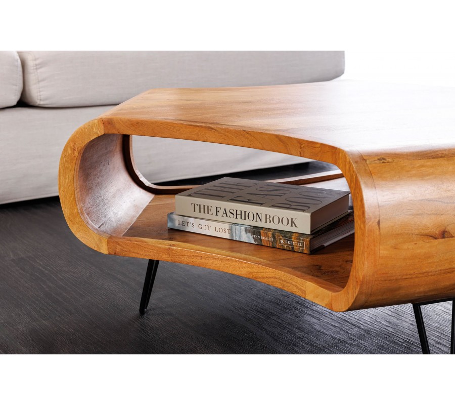 Moderní designový asymetrický konferenční stolek Spin s poličkou z medově hnědého akáciového dřeva s černými nožičkami 90 cm