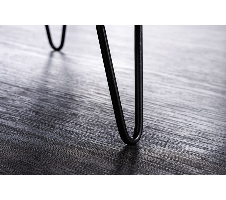 Tři nožičky jsou vyrobeny z kovu v matné černé barvě a dodávají stolku industriální výraz. Tenká kovová linie je ohnutá do tvaru V a působí odlehčeným dojmem, který vyvažuje mohutnou siluetu vrchní části. Jejich zešikmené tvary zaručí výbornou stabilitu.