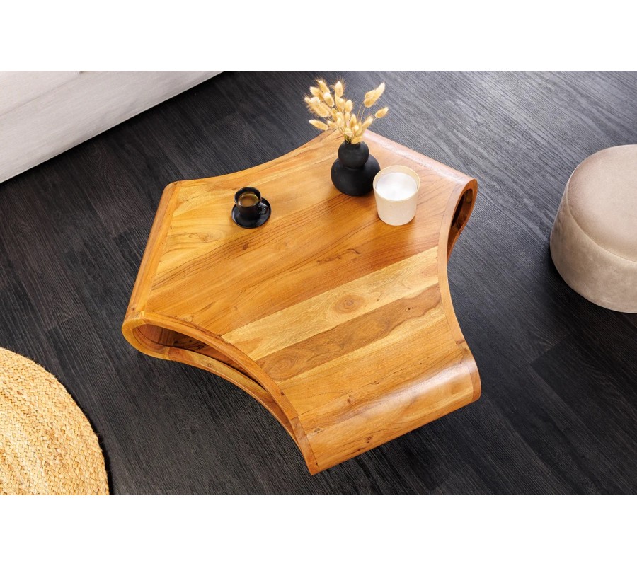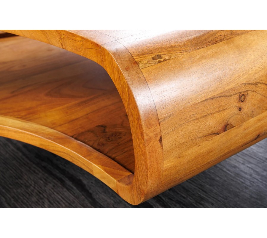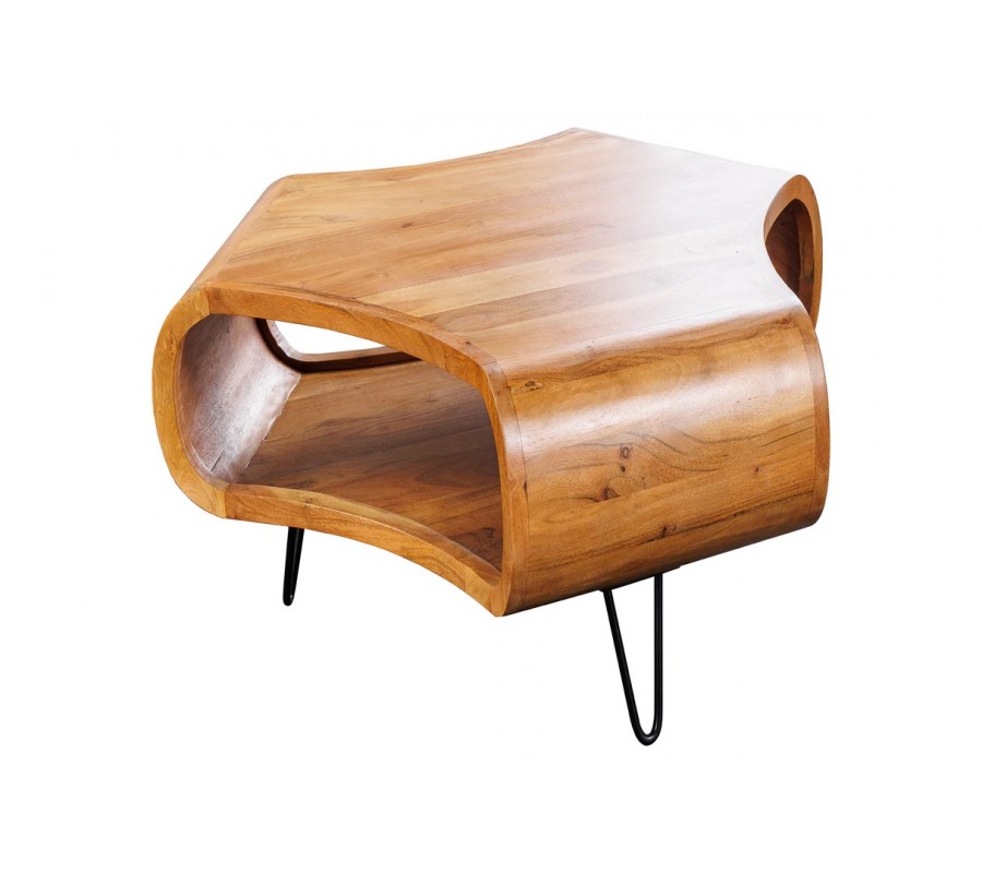 Industriální masivní konferenční stolek Spin je výrazným masivním kusem nábytku, který upoutá okamžitě svým atypickým tvarem. Je vyroben z akáciového dřeva v příjemném teplém hnědém odstínu s přirozeně výraznou kresbou dřeva, která je viditelná na horní desce i na oblých bočních stěnách.