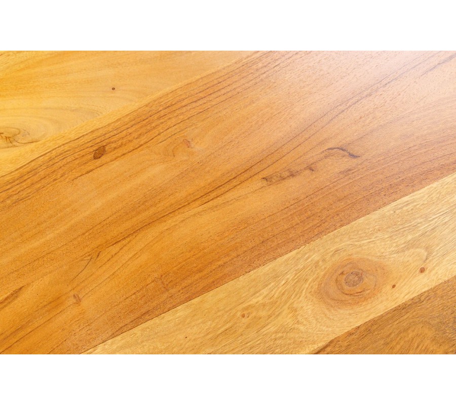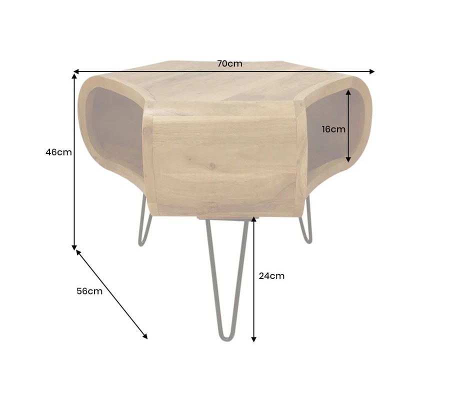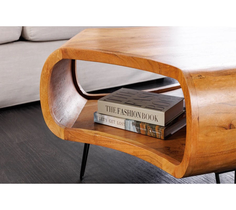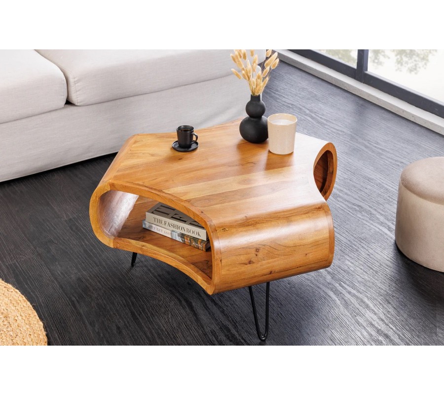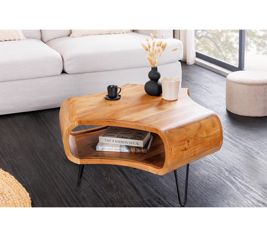 Oblé křivky, hrubé masivní provedení a kovové prvky dělají stolek ideálním do industriálních, moderních i přírodně laděných interiérů. Výborně bude ladit k neutrálním látkovým sedačkám, ke kovovým doplňkům, černým lampám ak dalším masivním kusům z akáciového dřeva.