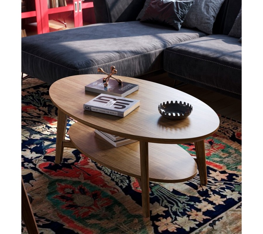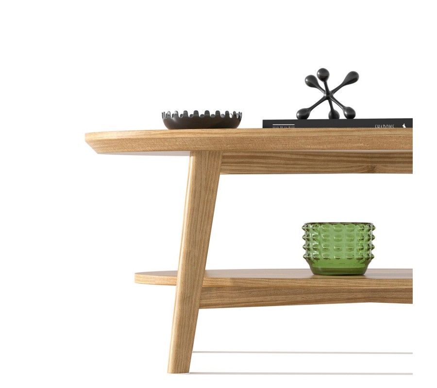 Pod hlavní deskou se nachází oválná spodní police, která je mírně menší než vrchní plocha a poskytuje praktický prostor pro knihy, časopisy nebo dekorace. Tento prvek zvyšuje funkčnost stolku bez narušení jeho lehkého a vzdušného vzhledu.