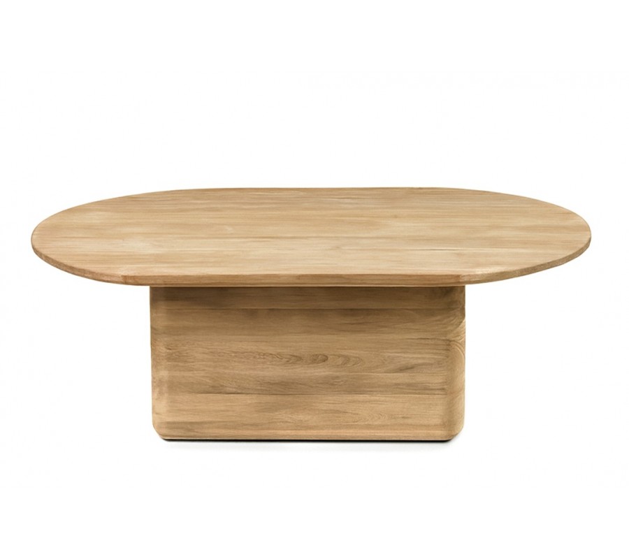 Luxusní masivní oválný konferenční stolek Riga s mohutnou hranatou nohou z teakového dřeva ve světle hnědé barvě 110 cm