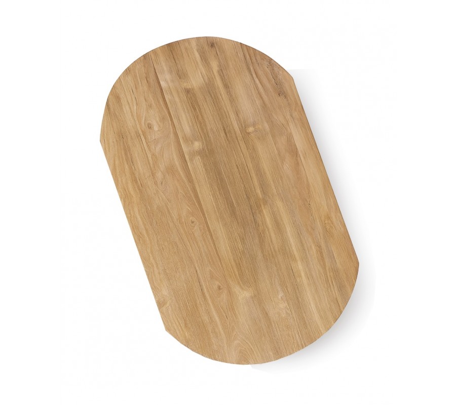 Stolek má minimalistickou siluetu, s ovální vrchní deskou, položenou na mohutné plné noze ve tvaru kvádru. Delší boční strany desky jsou rovné a jemně se prolamují do klenutých oblouků na kratších stranách. Výborně s nimi korespondují zaoblené rohy nohy. Spojení geometrických lineárních tvarů s pravidelnými křivkami působí moderním dojmem, ale vizuál je zároveň plynulý a elegantní.