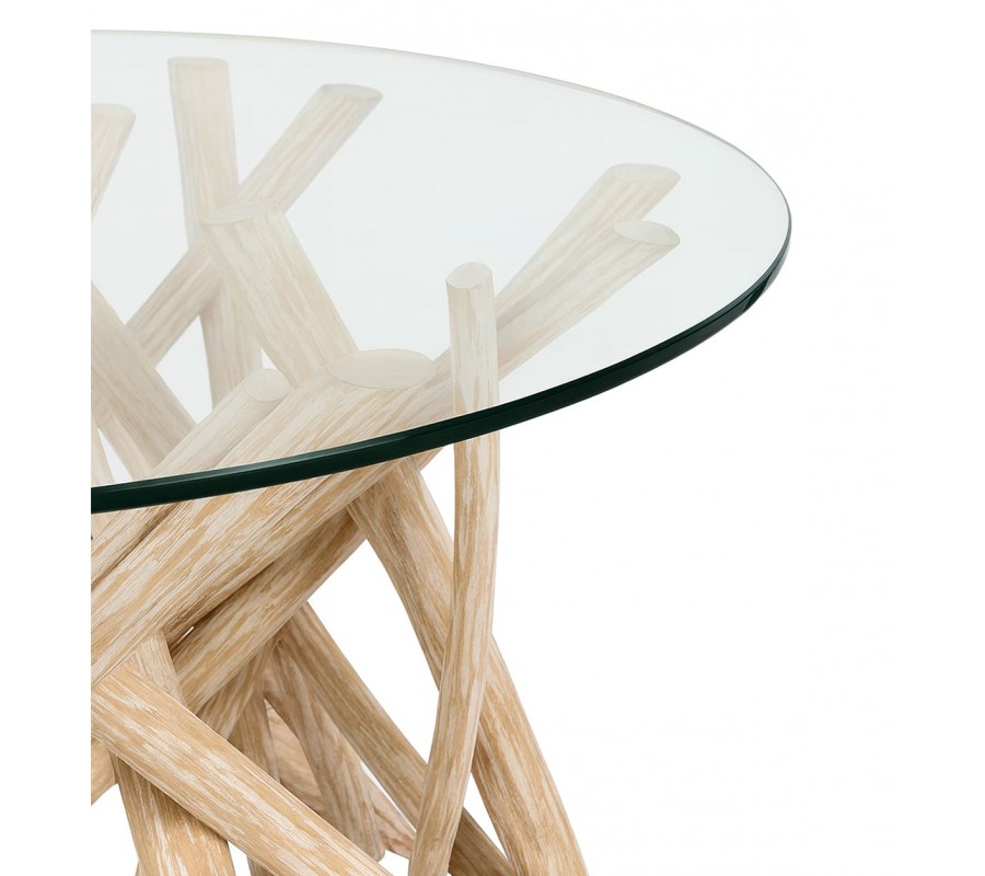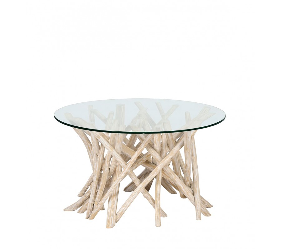 Podstava je vyrobena z běleného masivního teakového dřeva v elegantním světlém krémovém odstínu. Její nepravidelný design propletených větví a větviček působí organicky a připomíná naplavené dřevo. Ze stolku dělá nejen funkční nábytek, ale také přírodní dekorativní prvek místnosti. Teak je zároveň mimořádně pevný a odolný.
