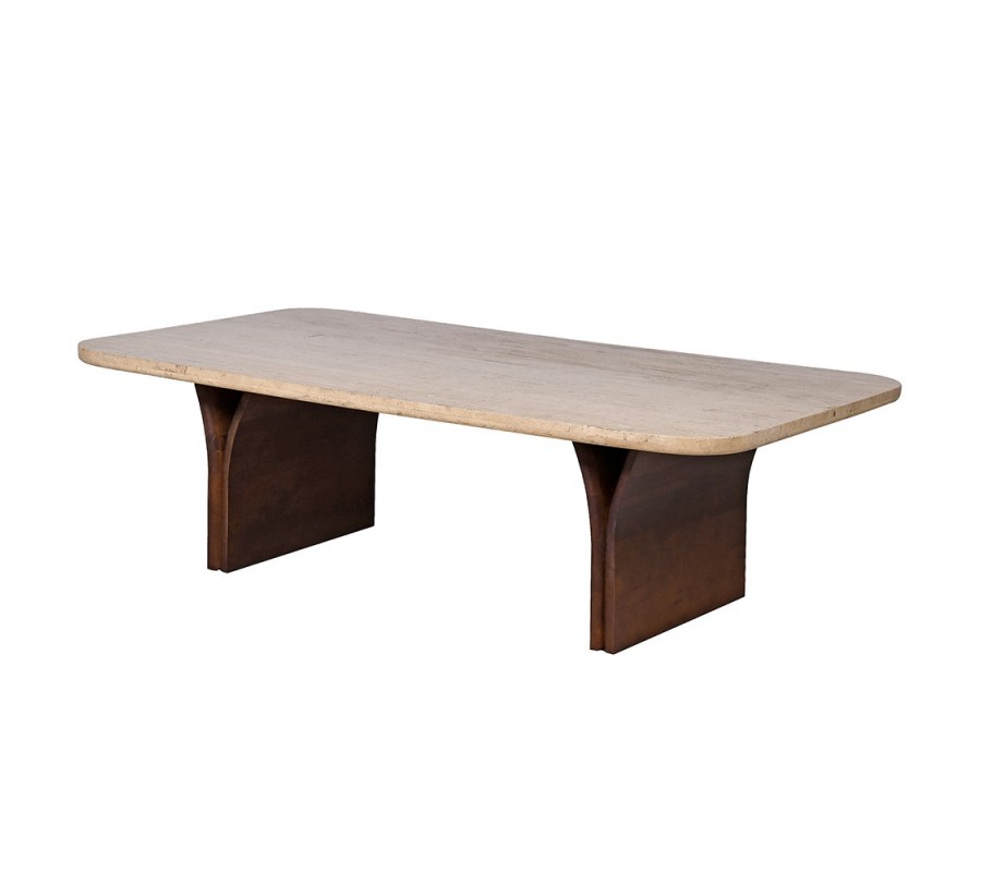 Luxusní moderní designový konferenční stolek Jedy ztravertinového mramoru působí elegantně, nadčasově a architektonicky čistě. Obdélníková deska se zaoblenými hranami je vyhotovena v jemné béžové barvě, která přirozeně zvýrazňuje strukturu kamene, jeho póry a jemné barevné přechody. Travertin dodává stolku exkluzivní charakter a přirozenou noblesu, přičemž každý kus je originálem díky jedinečné kresbě přírodního materiálu.