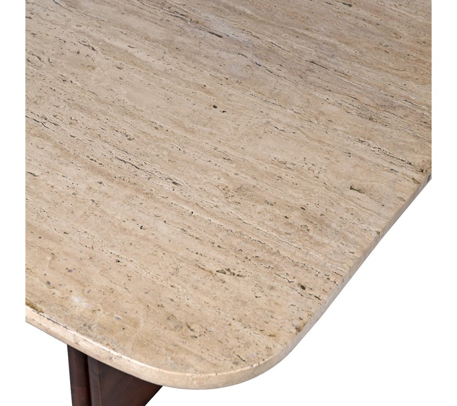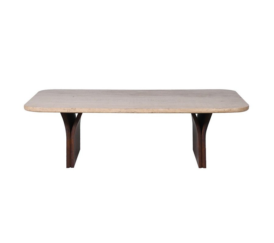 Luxusní designový obdélníkový konferenční stolek Jedy s hnědými akáciovými nožičkami a travertinovou béžovou deskou 137 cm