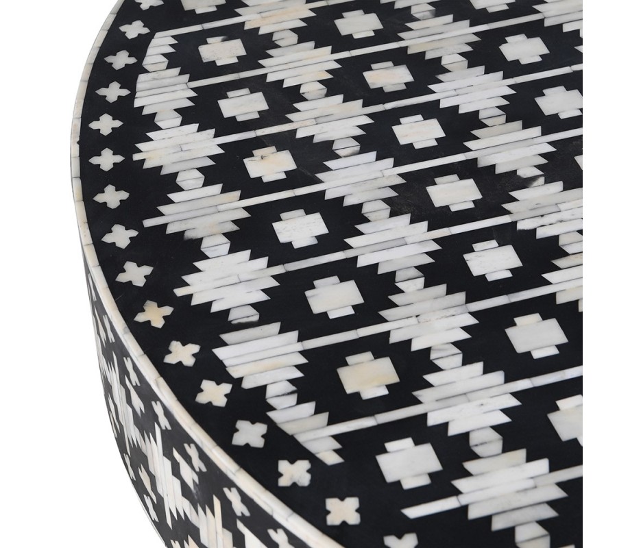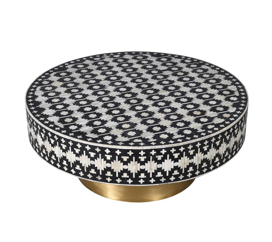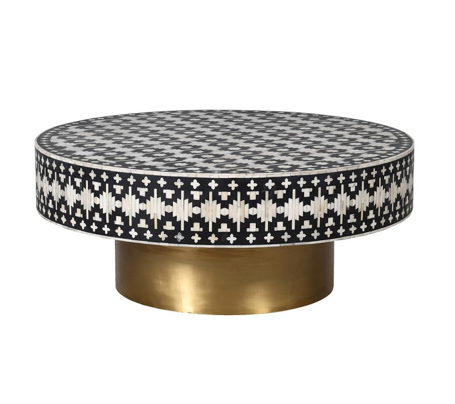 Etno kulatý černo bílý konferenční stolek Daytona s intarzií z buvolí kosti a mosaznou kovovou nohou 100 cm