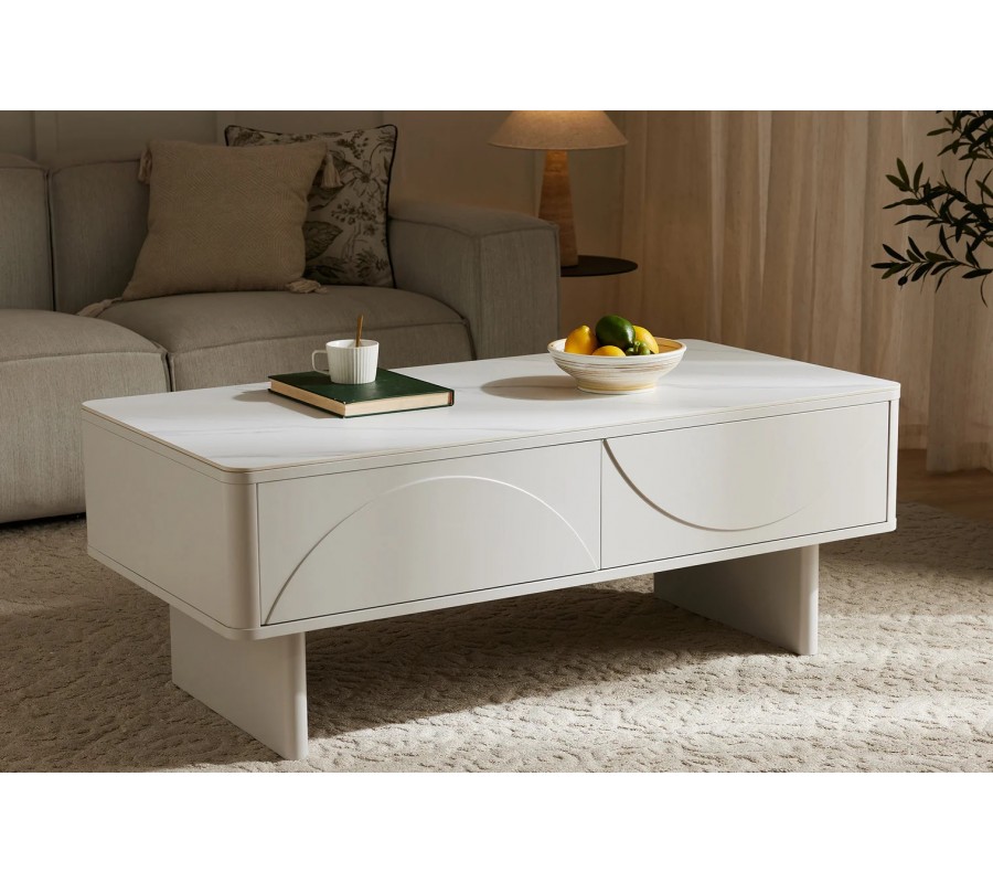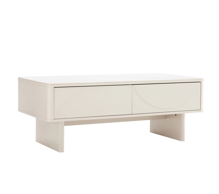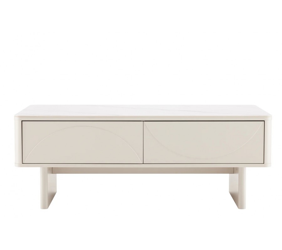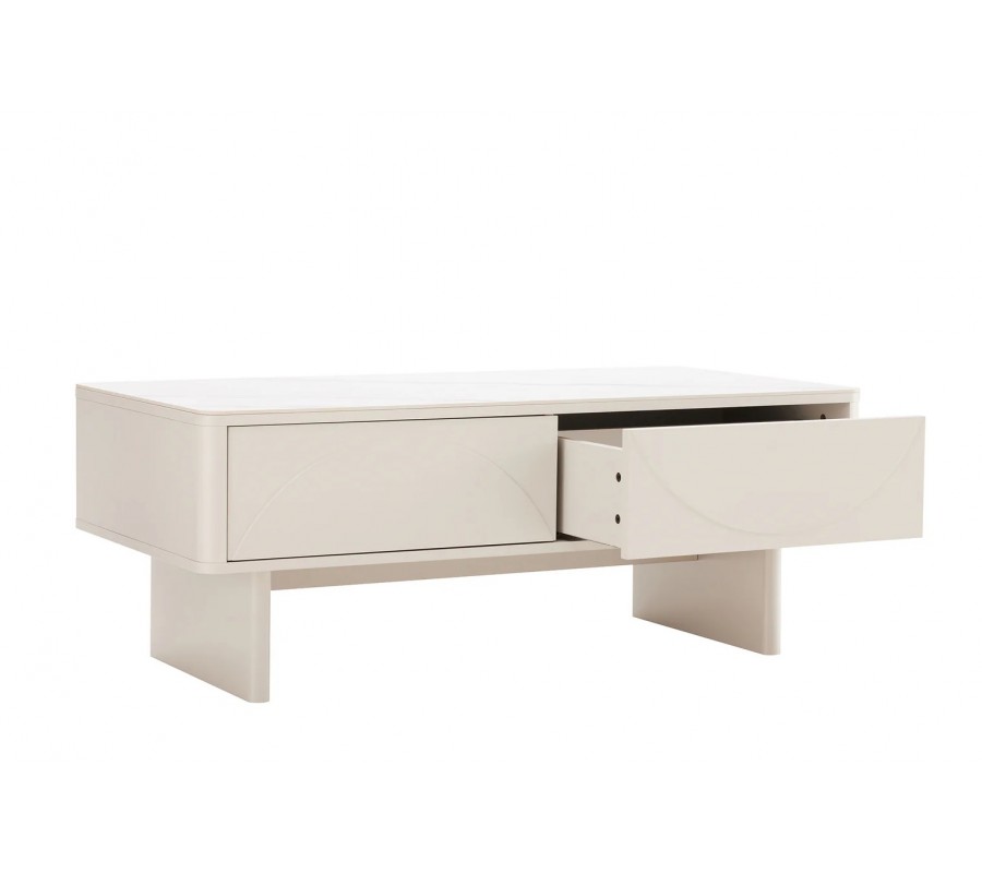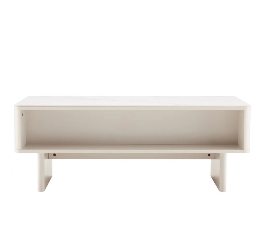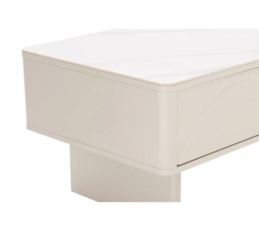 Konferenční stolek má obdélníkovou vrchní desku se zaoblenými rohy. Je vyrobena z keramiky, která poskytuje pevný a odolný povrch. Zdobí ji design bílého mramoru s jemnými šedými žilkami, která působí exkluzivně a podtrhuje art deco vizuál. Korpus a podstava stolku jsou vyrobeny z kvalitní dýhy s čistým bílým matným lakováním.