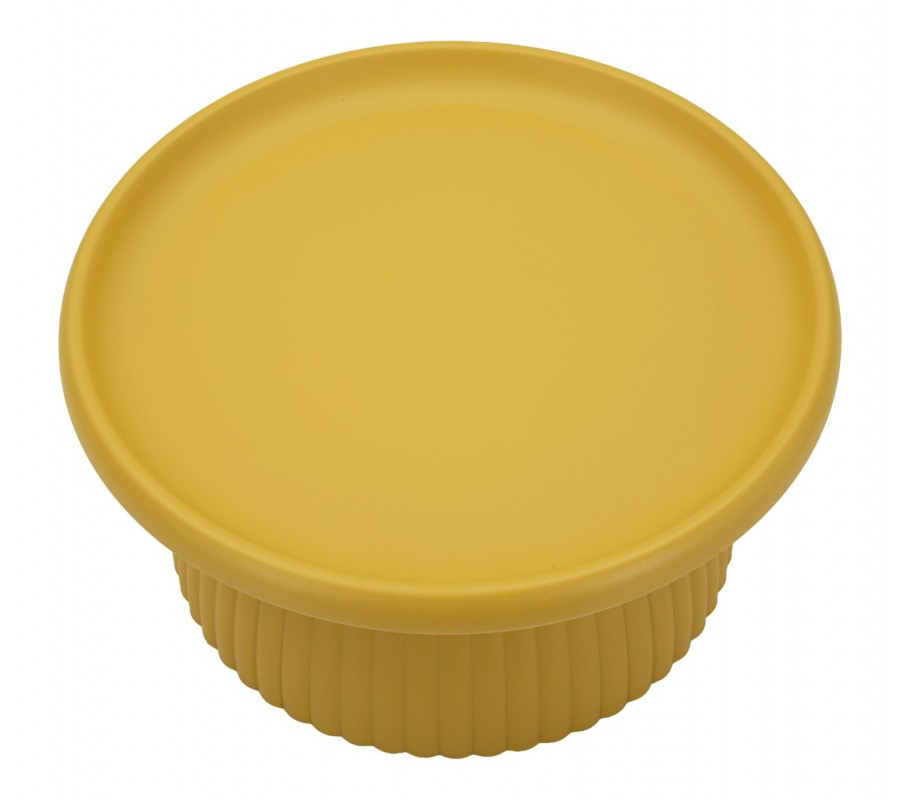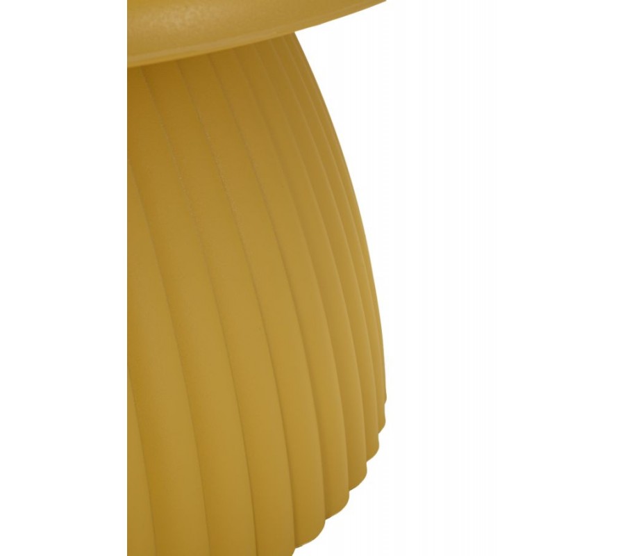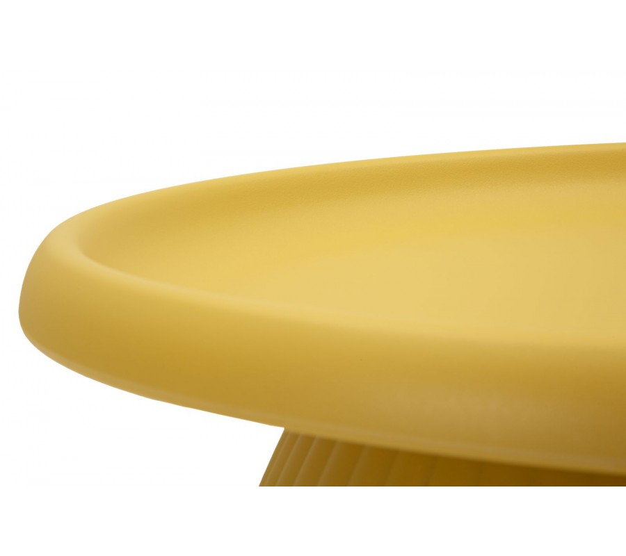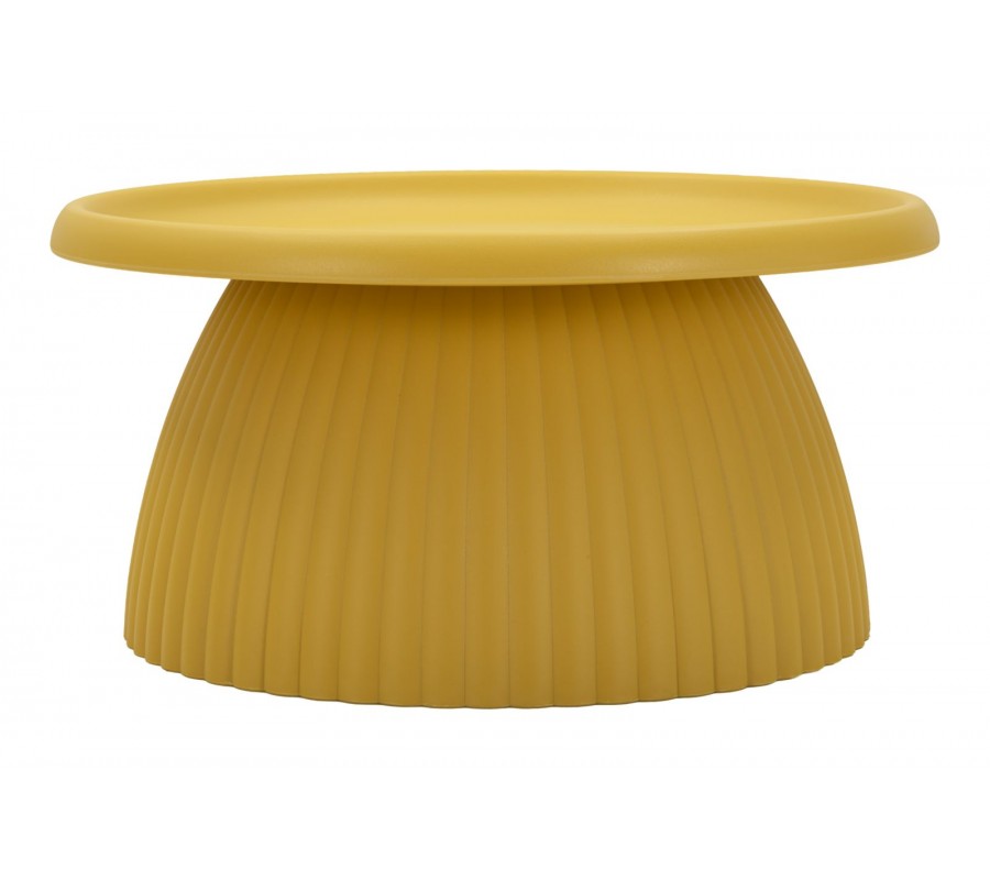 Moderní žlutý konferenční stolek Corralejo s kulatou deskou s vyvýšenými okraji a širokou žebrovanou nohou 70 cm