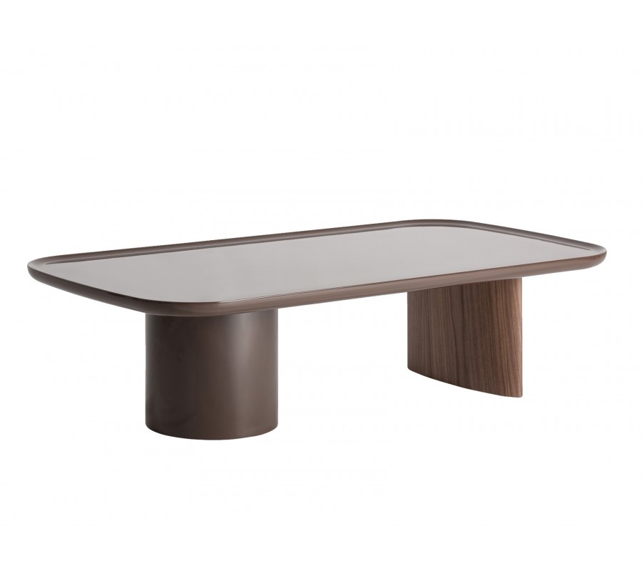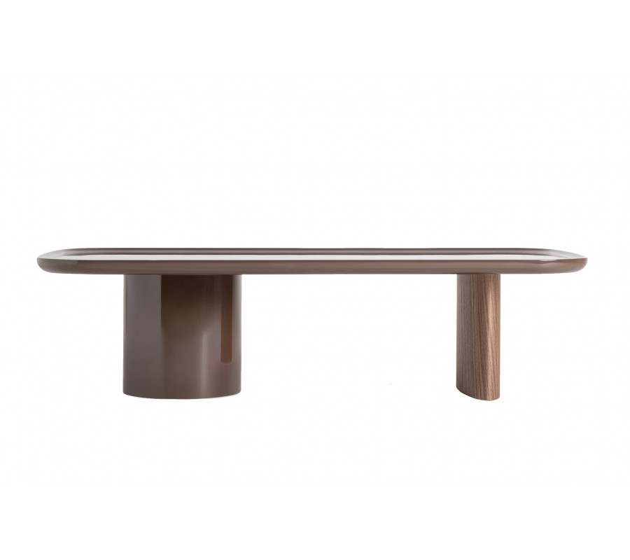 Luxusní art deco obdélníkový hnědý konferenční stolek Kirian s lesklým povrchem a kulatou a oválnou nohou 133 cm