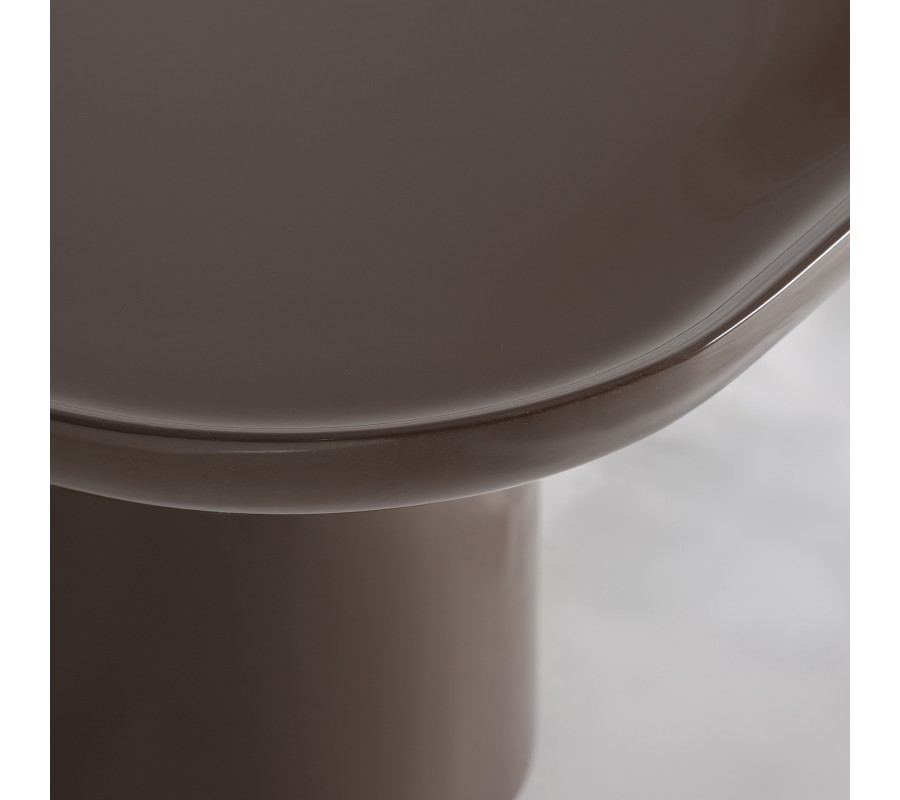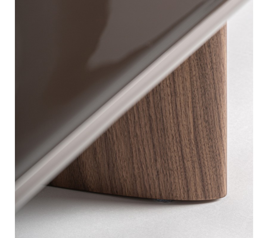 Konstrukci podpírají dvě výrazově odlišné nohy, které spolu vytvářejí zajímavou vizuální dynamiku. Jedna noha je kulatá, s hladkým lesklým hnědým povrchem, který ladí s vrchní deskou a působí kompaktně a elegantně. Druhá noha má oválný tvar s výraznou dřevěnou strukturou a přirozenou kresbou dřeva, čímž do designu vnáší kontrast textur a jemný architektonický akcent. Spojení hladkého lesku a přirozené dřevěné struktury vytváří sofistikovanou rovnováhu mezi moderní elegancí a přirozeným charakterem materiálu.
