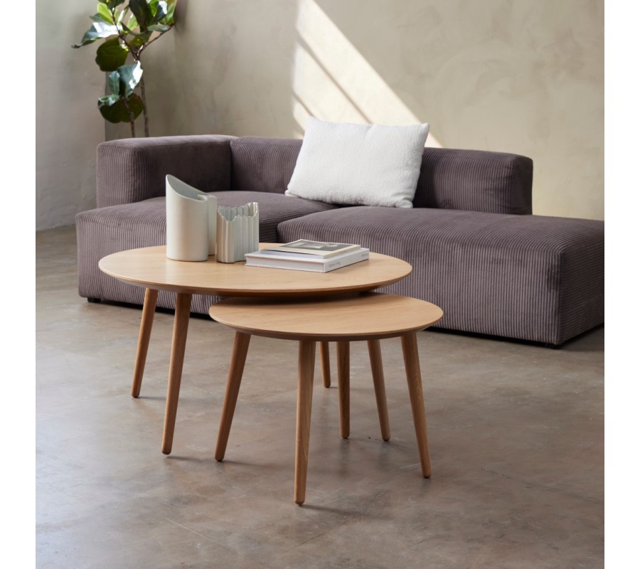 Sada konferenčních stolků Karena zaujme čistým moderním designem inspirovaným severskou estetikou a přirozenou krásou dřeva. Jednoduché linie, vyvážené proporce a výrazná kresba dřeva vytvářejí nadčasový nábytek, který do interiéru přináší lehkost, funkčnost a přirozenou eleganci. dýhy ve světle hnědé barvě, přičemž výrazná struktura letokruhů dodává povrchu přirozenou texturu a vizuální hloubku.