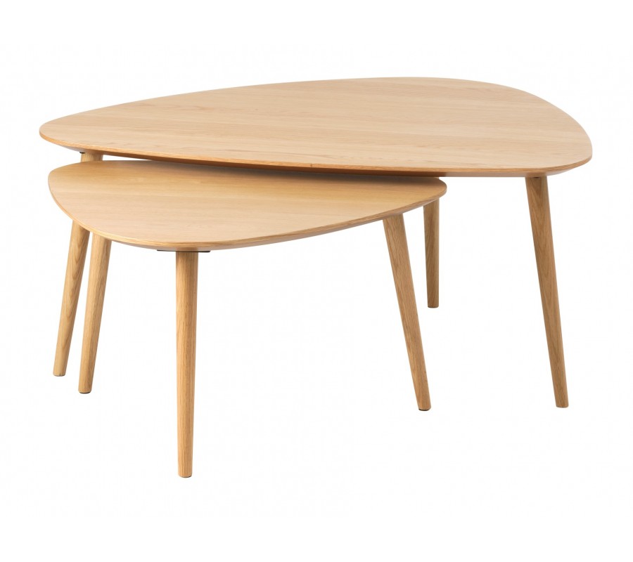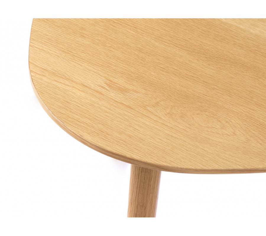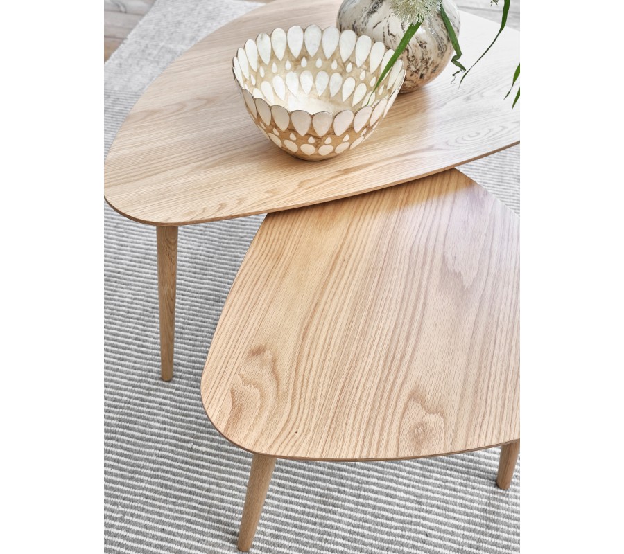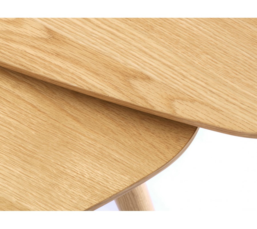 Skandinávská sada konferenčních stolků Halia zaujme čistým designem, přirozenou kresbou dřeva a funkční variabilitou typickou pro severský styl. Stolky mají trojúhelníkový tvar s oblými rohy, který působí měkce a organicky a zároveň dodává interiéru zajímavou geometrickou dynamiku. Povrch je vyhotoven z dubové dýhy v světle hnědé barvě, přičemž výrazná kresba letokruhů dodává stolkům přirozenou texturu a autentický dřevěný charakter.