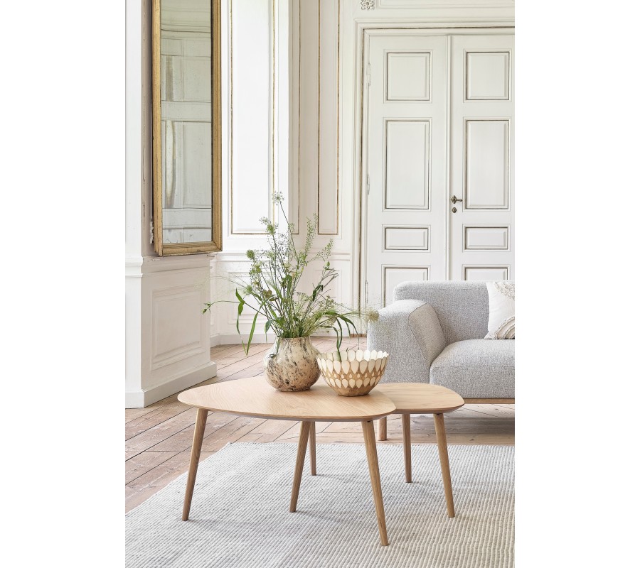 Sada konferenčních stolků Halia se výborně hodí do moderních obývacích pokojů, interiérů se severským charakterem nebo do minimalisticky laděných prostor, kde vynikne přirozená kresba dřeva a čistota tvarů. Krásně se kombinuje se sedačkami v béžových, krémových, šedých nebo pískových odstínech, s přírodními textiliemi jako len, vlna či bavlna. Harmonicky doplňuje materiály jako travertin, keramika, přírodní kámen nebo světlé dřevo, čímž vytváří útulný a vizuálně vyvážený interiér.